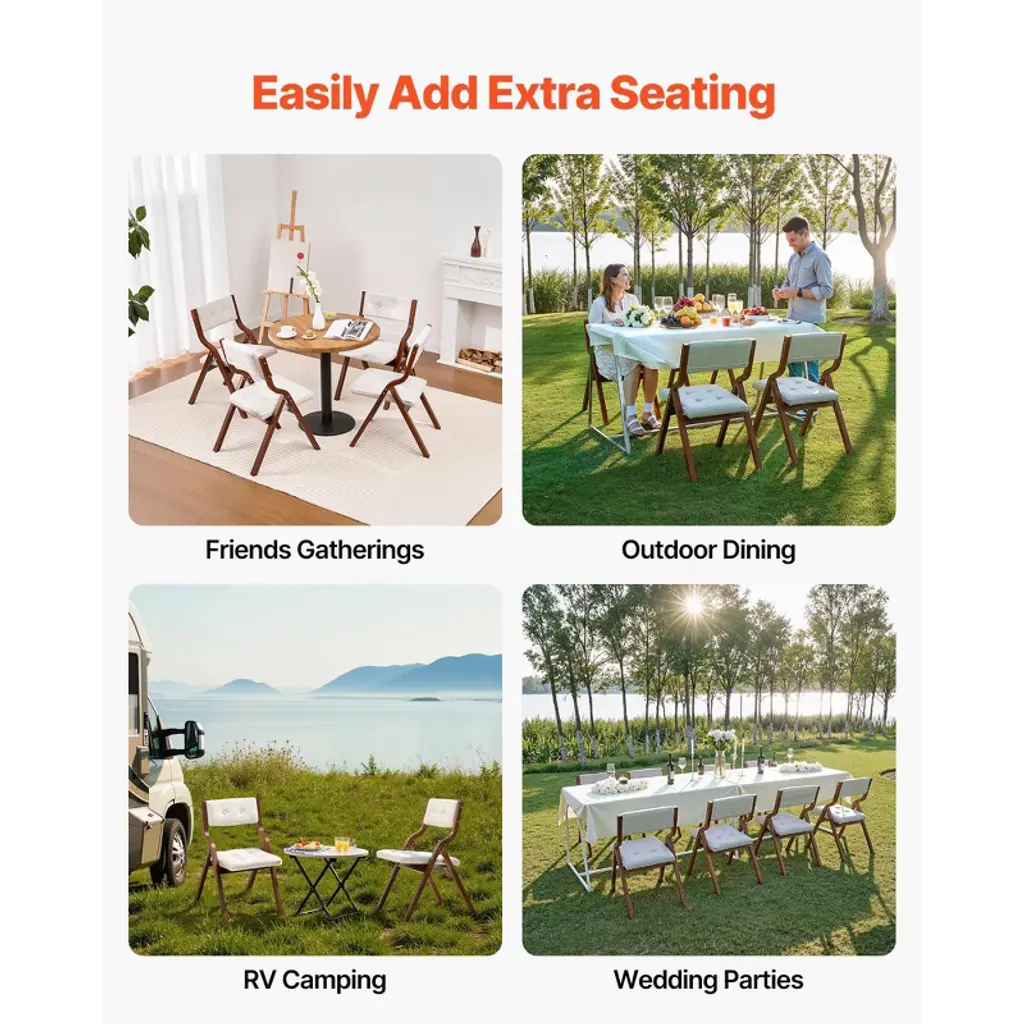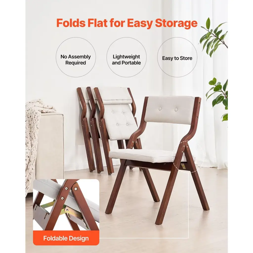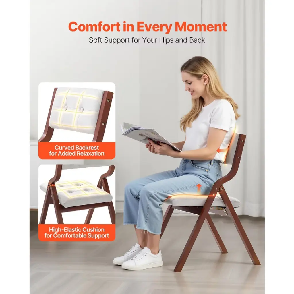 Feature: Reliable and Sturdy: The frame of the folding chair is made from high-quality bent wood, supporting up to 400 lbs / 180 kg. The anti-slip feet and triangular wood frame provide excellent stability and avoid tipping. Comfortable Seating: The seat cushion and backrest feature high-density foam support, alleviating pressure on the hips and back. Experience optimal support for a comfortable feeling while reading, resting, or dining. The tech fabric is scratch-resistant, skin-friendly, and breathable. Foldable Design: Easy to carry and compact when folded. The folding cushion chair requires no assembly and can be quickly unfolded or folded back. When not in use, it can be easily stored in a corner, under a bed, or in your vehicle. Extra-Large Seat Cushion: The oversized seat of the dining folding chairs provide unmatched comfort and extra space. It accommodates various body types, providing the most comfortable sitting posture. 2-Piece Set: A modern wooden folding chair set that fits a variety of home or party styles. It can be used as a dining chair, small bistro chair, guest chair, office chair, camping chair, conference chair, or garden chair. It's the ideal seating solution for event planners. Package Content: 2 x Folding Chairs 2 x Hex Wrenches 1 x Screw 1 x Nut 10 x Non-slip Foot Pads 1 x Instruction Manual