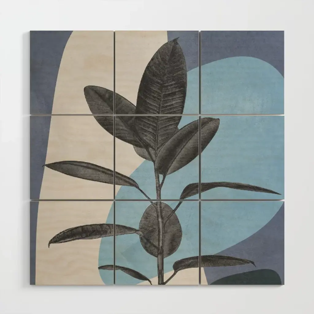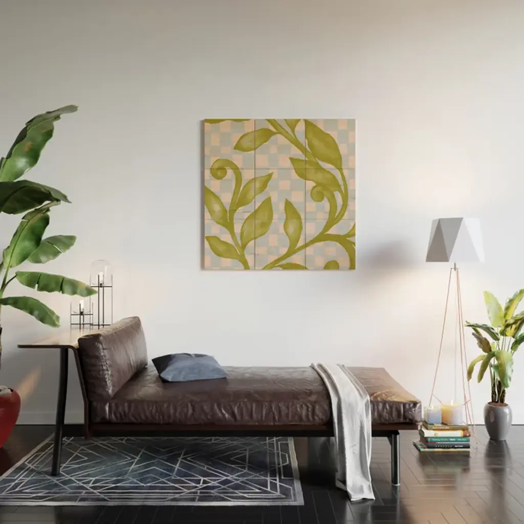 Vibrant Green Leaves On A Blue Checkered Background Wood Wall Art
