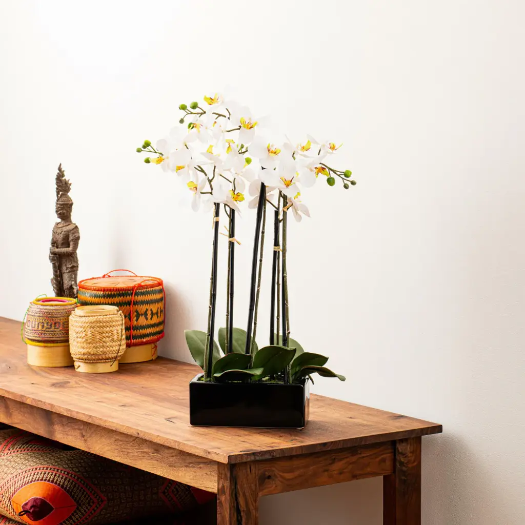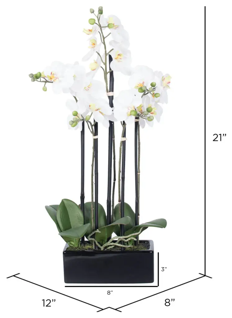 Vickerman 21" Artificial White Potted Orchid Features 5 Stems With Leaves, Roots, And Moss Filler In A Rectangular Black Glossy Ceramic Container. 70%Plastic, 10%Wire, 20ramic Pot
