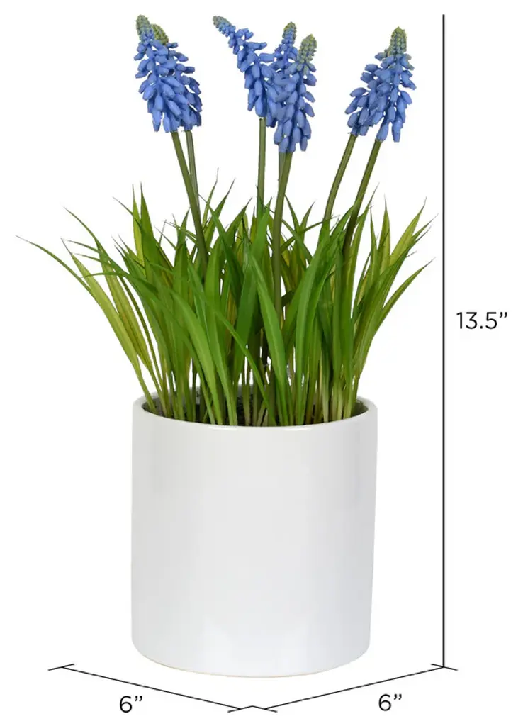 Vickerman 13.5" Artificial Purple Hyacinth Flower in Ceramic Pot. Create a calming and cozy space with the addition of this purple hyacinth in a simple white pot. The pot is 5" high by 5.5" wide