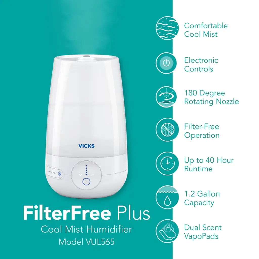 Creating a comforting environment just got easier. With sleek touch controls and no filters to replace, the Vicks FilterFree Plus Cool Mist Humidifier makes it simple to provide your family with essential moisture, helping to soothe a stuffy nose, coughing and congestion. You can use this humidifier with Vicks VapoPads to provide further comfort with the soothing Vicks scent. Plus, the wide tank opening makes filling and cleaning a breeze. Support better breathing and a more comfortable bedtime, easily and conveniently with the FilterFree Plus.