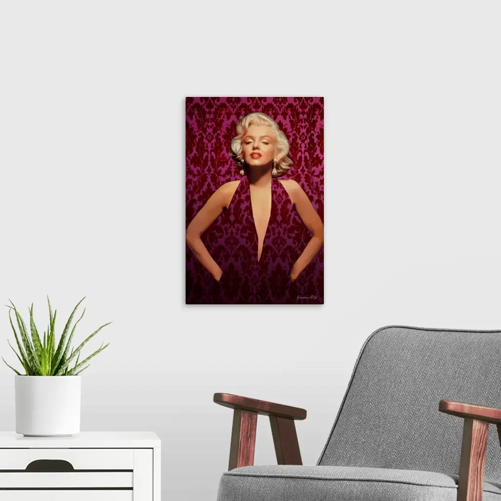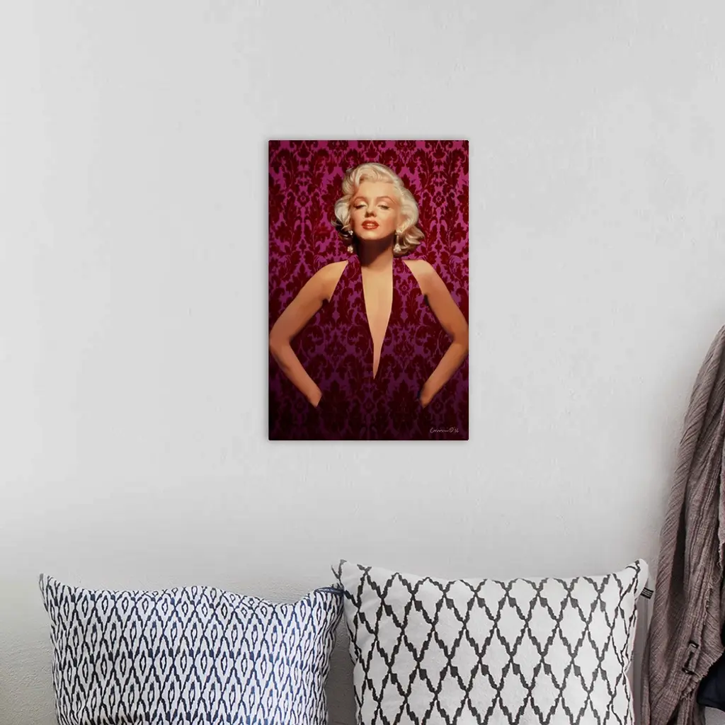 Portrait of Marilyn Monroe wearing a pink and red patterned dress that blends in with the wall behind her.