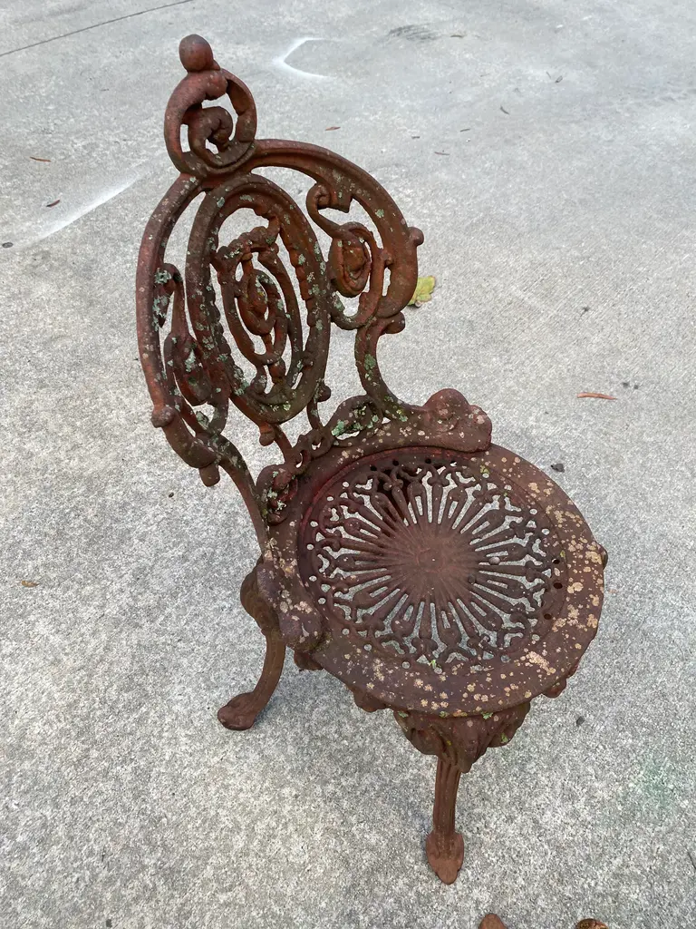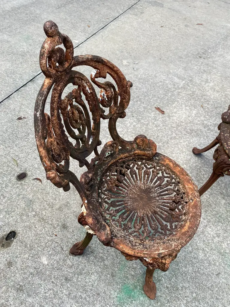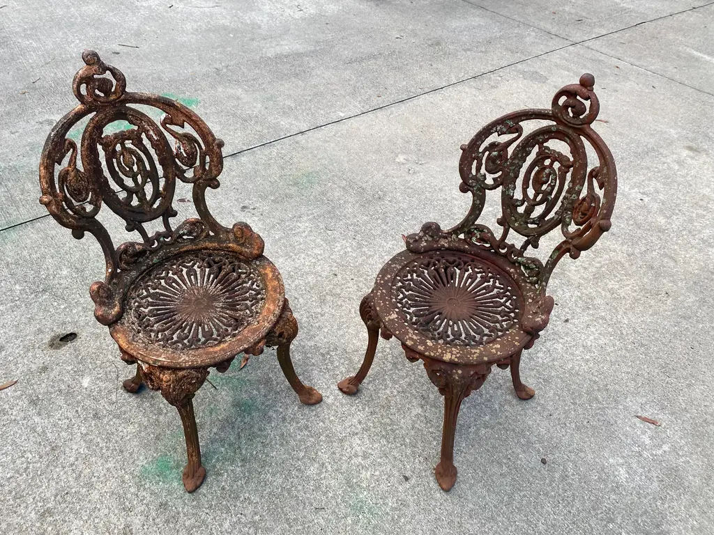 This is a beautiful set of outdoor metal garden chairs. These chairs are sculpted with unique designs on the back and seat. Perfect for the interior designer or the enthusiast!