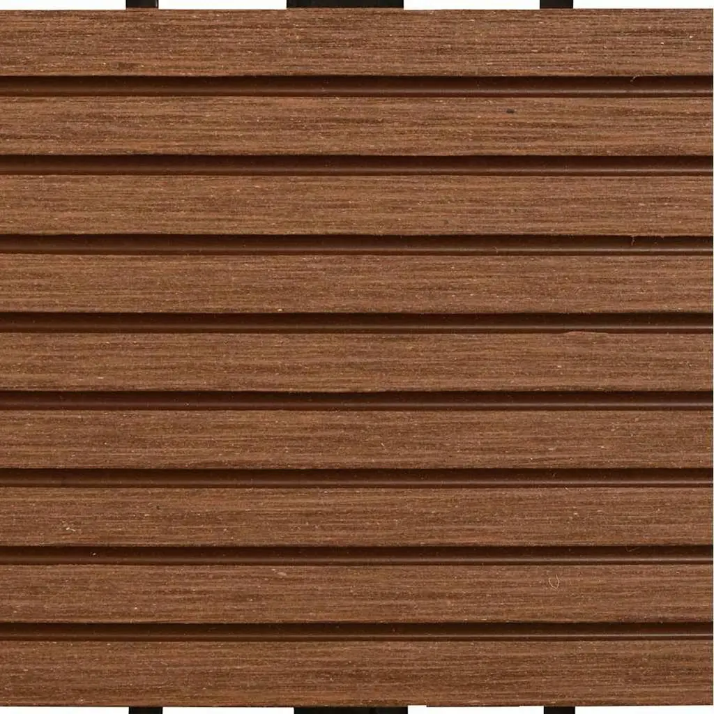 This WPC decking tile set, with an individual tile size of 11.8" x 11.8", consists of 11 pieces and covers a total surface area of 10.8 ft². It will be perfect for patios, balconies, bathrooms, or your pool or spa area.These high-quality WPC tiles feature a quick connect interlocking system, allowing you to easily and quickly install them without the need for tools. Made of high-quality wood plastic composite, our tiles are water-proof and highly durable.