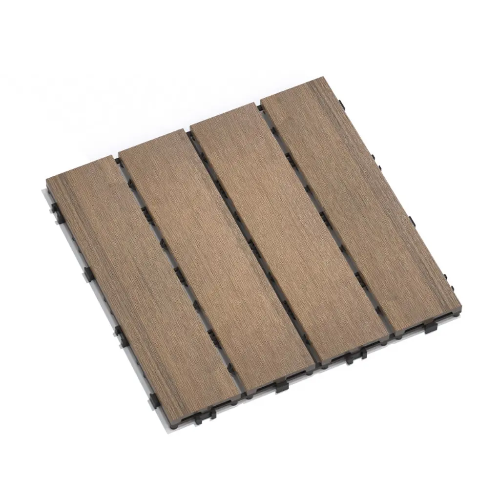 This WPC decking tile set, with an individual tile size of 11.8" x 11.8", consists of 11 pieces and covers a total surface area of 10.8 ft². It will be perfect for patios, balconies, bathrooms, or your pool or spa area.These high-quality WPC tiles feature a quick connect interlocking system, allowing you to easily and quickly install them without the need for tools. Made of high-quality wood plastic composite, our tiles are water-proof and highly durable.