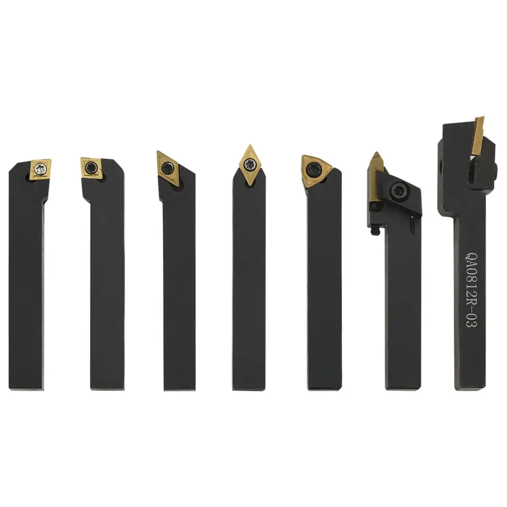 This set of 0.31 " turning tools consists of various tools for turning, cutting and threading. These carbide tips are suitable for turning steel and steel alloys. It is an ideal tool set for the lathe.These tools are made from carbon steel and cemented carbide, offering high hardness and good toughness. Holders feature black oxide smooth finish, marked with tool holder style and shank size. The insert of each tool is replaceable and indexable. The interchangeable keys are also included in the delivery. The set is delivered with a box for easy storage and transport.