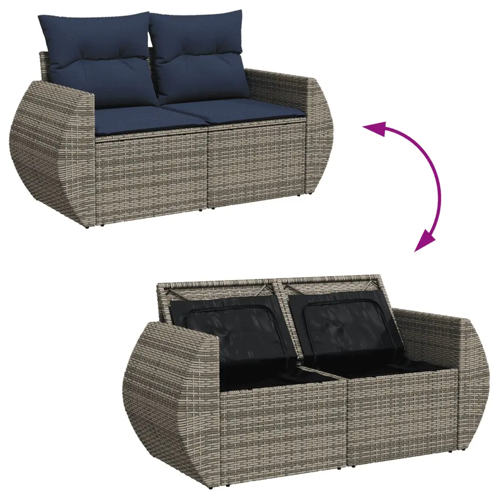 This garden sofa set is the perfect addition to your backyard, terrace, or patio, providing a comfortable and inviting space for chatting with family and friends or simply relaxing and enjoying the outdoors.Durable material: PE rattan, also known as poly rattan, is a strong, low-maintenance synthetic material that looks like natural rattan. It's lightweight, easy to clean, and commonly used for outdoor furniture due to its durability and weather-proof properties.Storage function with water-proof bag: Each garden seat features storage space under the seat, complete with a water-proof bag for storing cushions, toys, and other items. The inner bags have a top cover and can be securely fastened to the seats with hook-and-loop fasteners for added stability.Comfortable seat experience: This outdoor furniture, complete with thickly padded cushions, offers a comfortable seating experience.Removable and washable cover: These seat cushions feature removable covers for easy washing and maintenance.Modular design: This outdoor furniture set has a modular design, making it completely flexible and easy to move around, so you can create a customized outdoor furniture arrangement.Good to know:To make sure your outdoor furniture stays beautiful, we recommend protecting it with a waterproof cover.