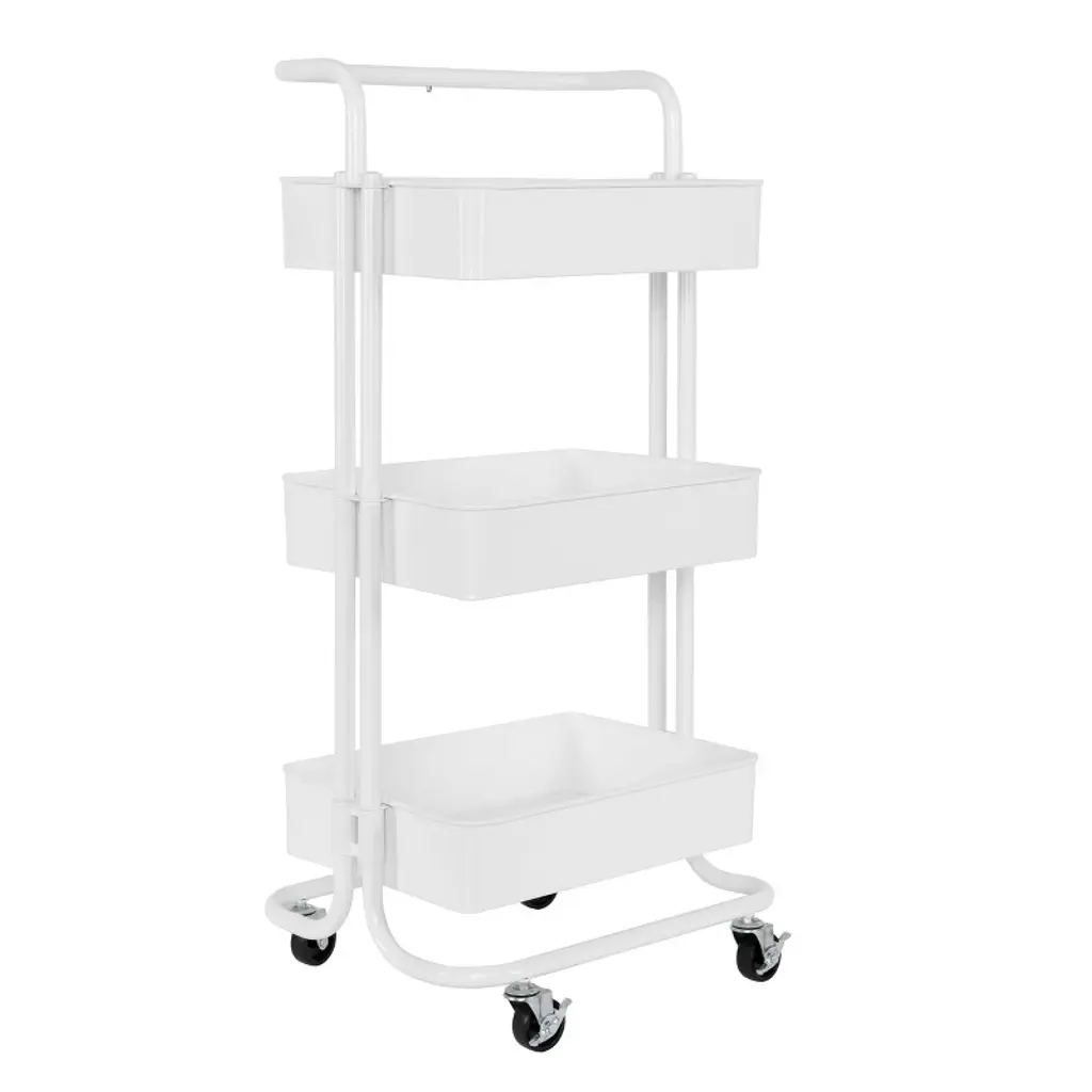 This trolley is perfect for organizing and sorting stuff in the kitchen, bathroom, office, etc.This household trolley, with a practical handle, is made of strong ABS plastic with iron tubes, making it sturdy and durable. The space-saving cart has 4 wheels, and 2 wheels have brakes for easy moving and stalling. The removable baskets are strong enough to provide additional storage space and make full use of the room. The trolley is ideal for storing toys, keys, food, etc.