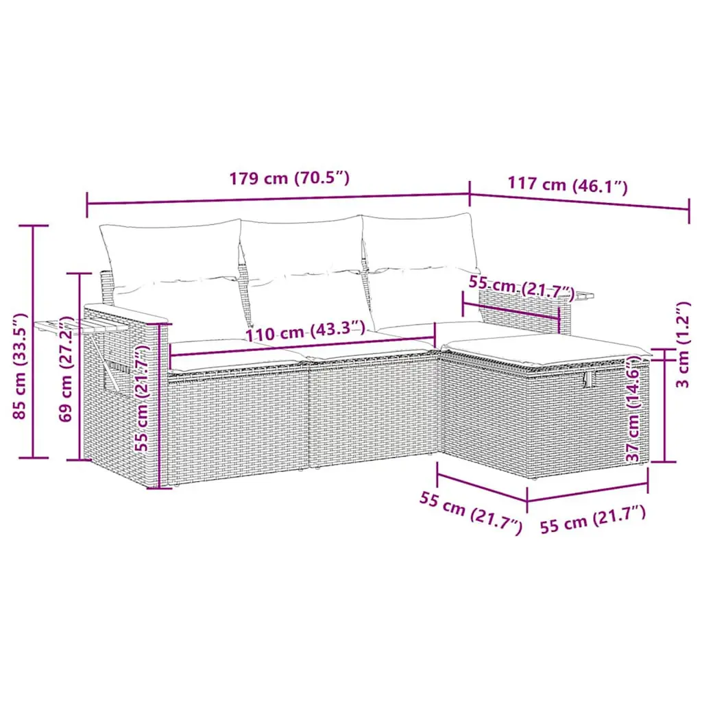 This garden sofa set is the perfect addition to your backyard, terrace, or patio, providing a comfortable and inviting space for chatting with family and friends or simply relaxing and enjoying the outdoors.Durable material: PE rattan, also known as poly rattan, is a strong, low-maintenance synthetic material that looks like natural rattan. It's lightweight, easy to clean, and commonly used for outdoor furniture due to its durability and weather-proof properties.Storage function with water-proof bag: Each garden seat features a storage space under the seat, complete with a water-proof bag for storing cushions, toys, and other items. The inner bag has a top cover and can be securely fastened to the seat with hook-and-loop fasteners for added stability.Versatile footstool: The stool is versatile, serving as a comfortable footrest for when you're lounging on the sofa or as an extra seat in your garden.Removable and washable cover: These seat cushions feature removable covers for easy washing and maintenance.Robust and stable frame: The powder-coated steel frame is strong, stable, and durable, with excellent performance in harsh weather, ensuring long-lasting performance.Good to know:To make sure your outdoor furniture stays beautiful, we recommend protecting it with a waterproof cover.