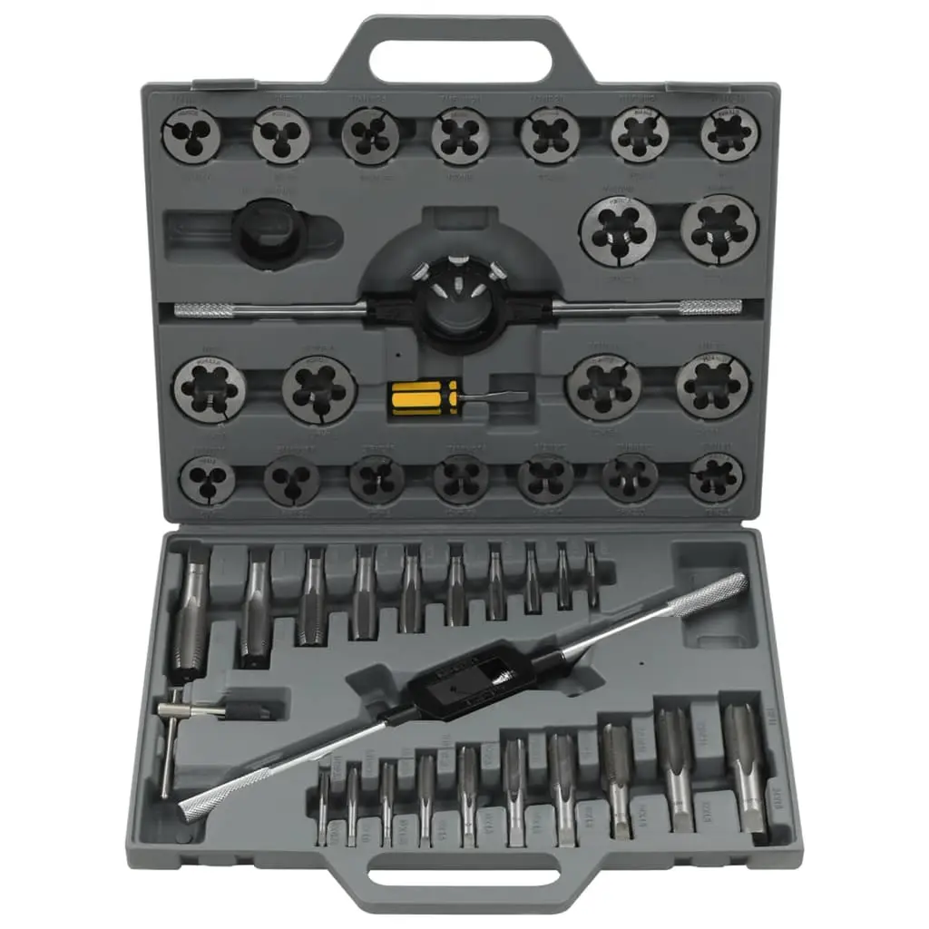This 45-piece practical tap and die set is perfect for cleaning and cutting internal and external threads, and can be used for automotive and general mechanical workshop purposes.Manufactured from high-quality carbon steel, the tools are heat treated and tempered for strength and durability.Thanks to the included convenient carrying case, these tools are easy to transport and do not take up too much storage space.Delivery includes 1 x tap wrench 1.97 ", 1 x tap wrench M6-M25, 1 x T-Handle tap wrench, 1 x screwdriver, 1 x die holder 1.97 ", 20 x taps and 20 x dies.
