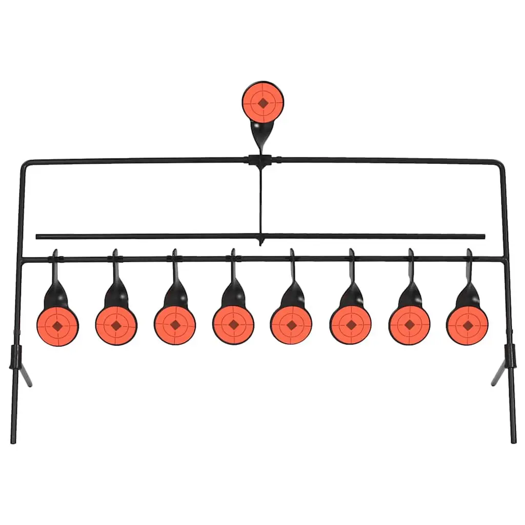 This auto reset rotating target with 8 + 1 targets will be a great training aid to improve your shooting skills and accuracy.The auto reset rotating target is great for competitions or target practice. Shoot the 8 lower targets first and the upper middle target last to automatically reset without needing to walk downrange. With bright orange target stickers, the targets are extremely easy to see even from a far distance.Thanks to the heavy-duty steel frame with two extra support legs, our rotating shooting target is sturdy and built to last. It folds flat quickly for easy storage.