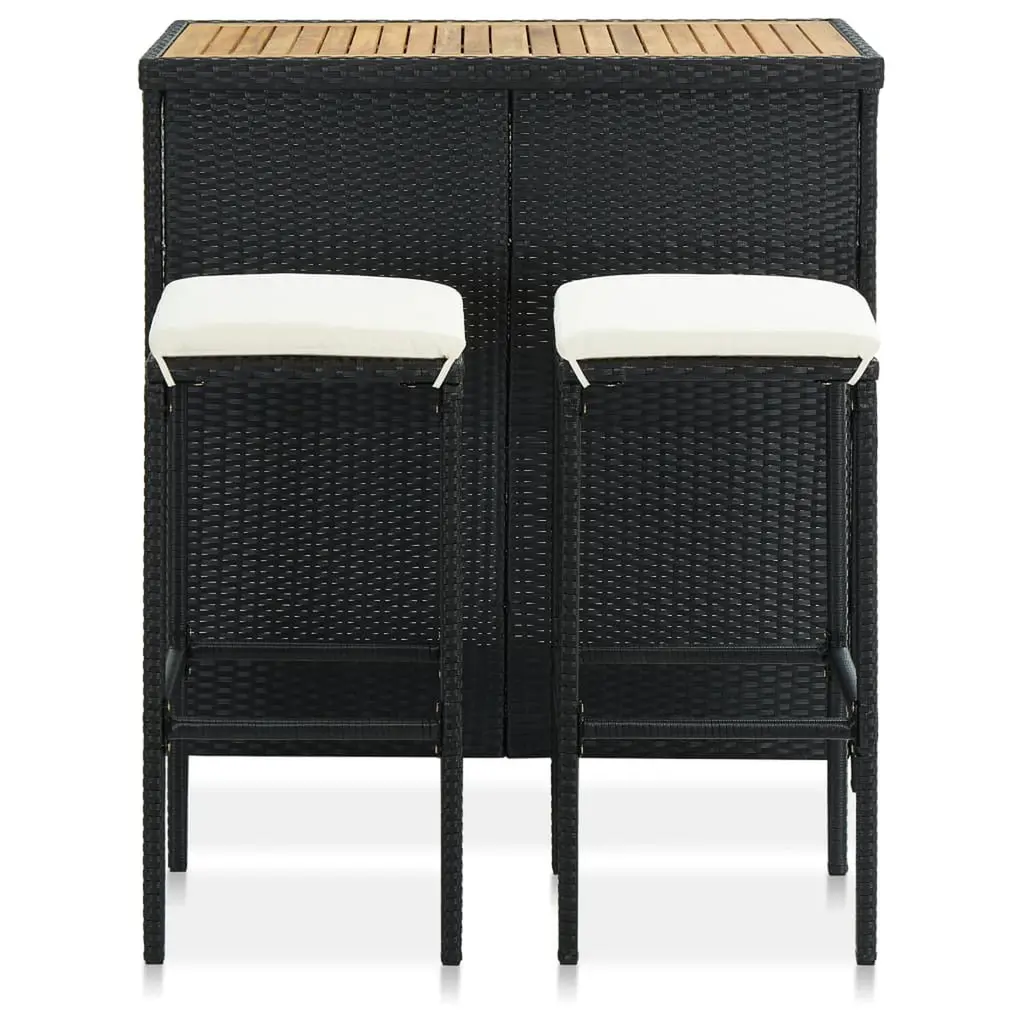 This fab 3-piece bar set mixes practicality with style, making it a great addition to any dining area, kitchen, or balcony. The lovely black and cream shades create a cozy, welcoming vibe, perfect for having friends over or enjoying meals and drinks in a modern setting. Stylish and Functional: The bar set's contemporary design features a sleek finish that complements any decor style, while the solid acacia wood table surface ensures durability and practicality.Comfortable Seating: Each stool has a comfy cushion with a zipper for easy removal, making it a pleasure whether you’re having a casual meal or hosting a cocktail night.Space-Saving Design: With its compact rectangular shape and minimalist aesthetic, this bar set fits right into smaller spaces without losing any functionality.Outdoor Versatility: Designed for both indoor and outdoor use, it's perfect for both a home bar vibe and summer balcony hangouts.Easy Maintenance: Thanks to removable covers and easy-clean materials, keeping this set looking fresh is a breeze, so you can focus on enjoying your space.