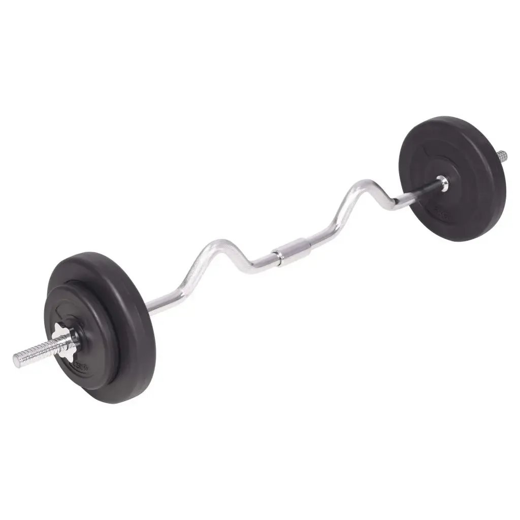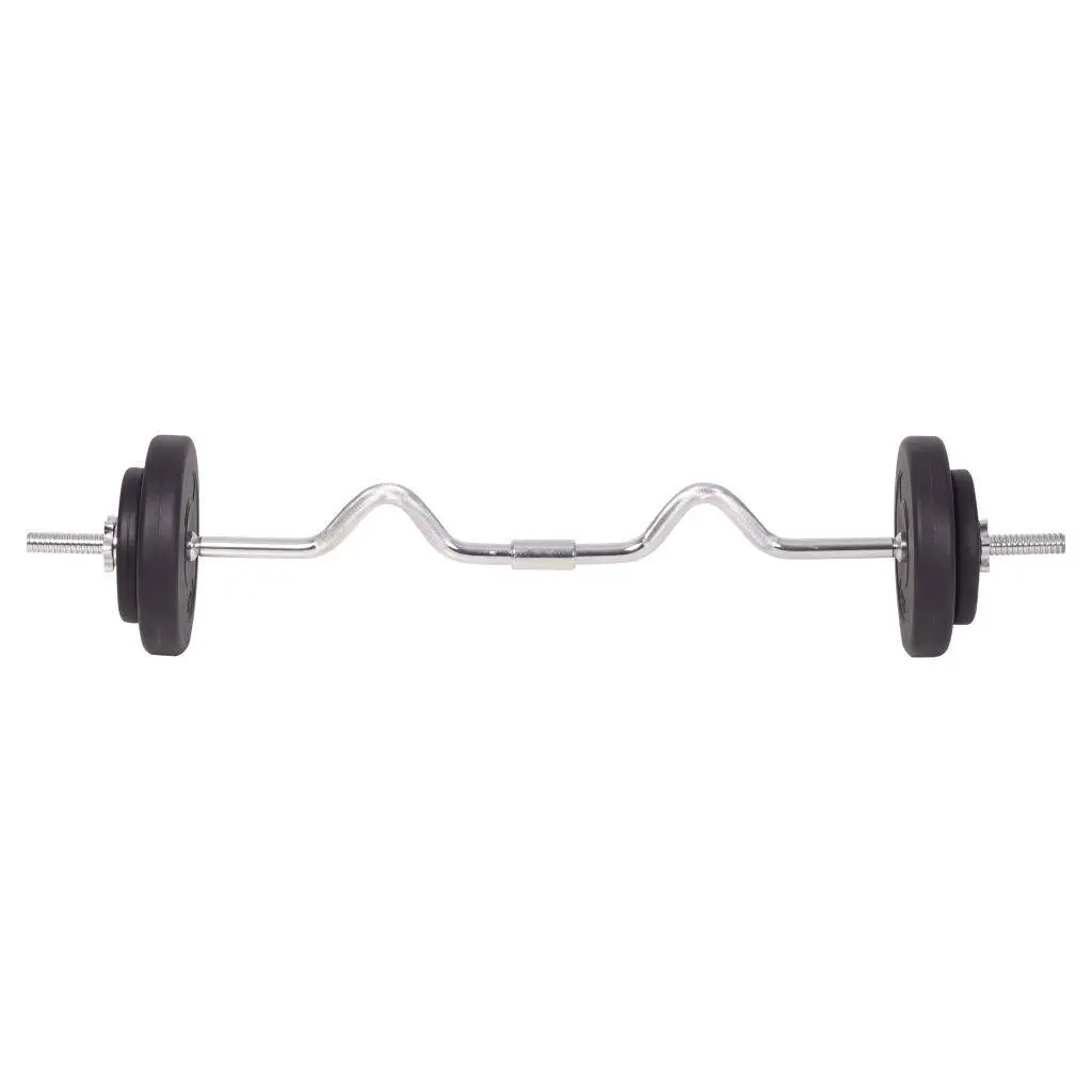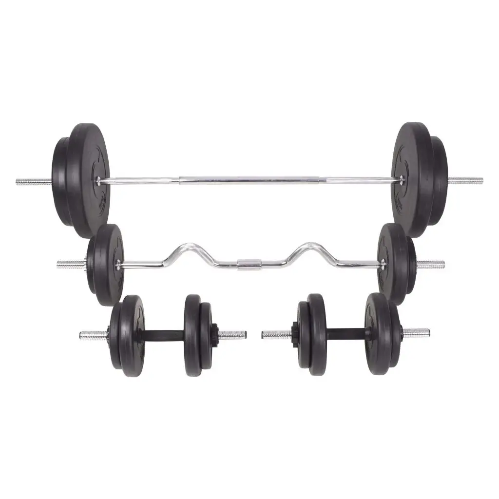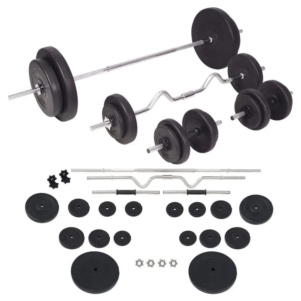 This versatile barbell and dumbbell set is perfect for chest, biceps, arms, triceps and back muscles. It includes two 33.1 lb plates, two 22 lb plates, two 11 lb plates, four 5.5 lb plates, six 2.8 lb plates, two barbell bar and two dumbbell bar and has a total weight of about 198.4 lb. This set allows the users to variably select the weights they want to lift for different exercises. These plates are made of cement with a plastic shell and they can easily be secured onto the bars with the included star locks. The weight is clearly stamped on each plate for quick and easy identification.