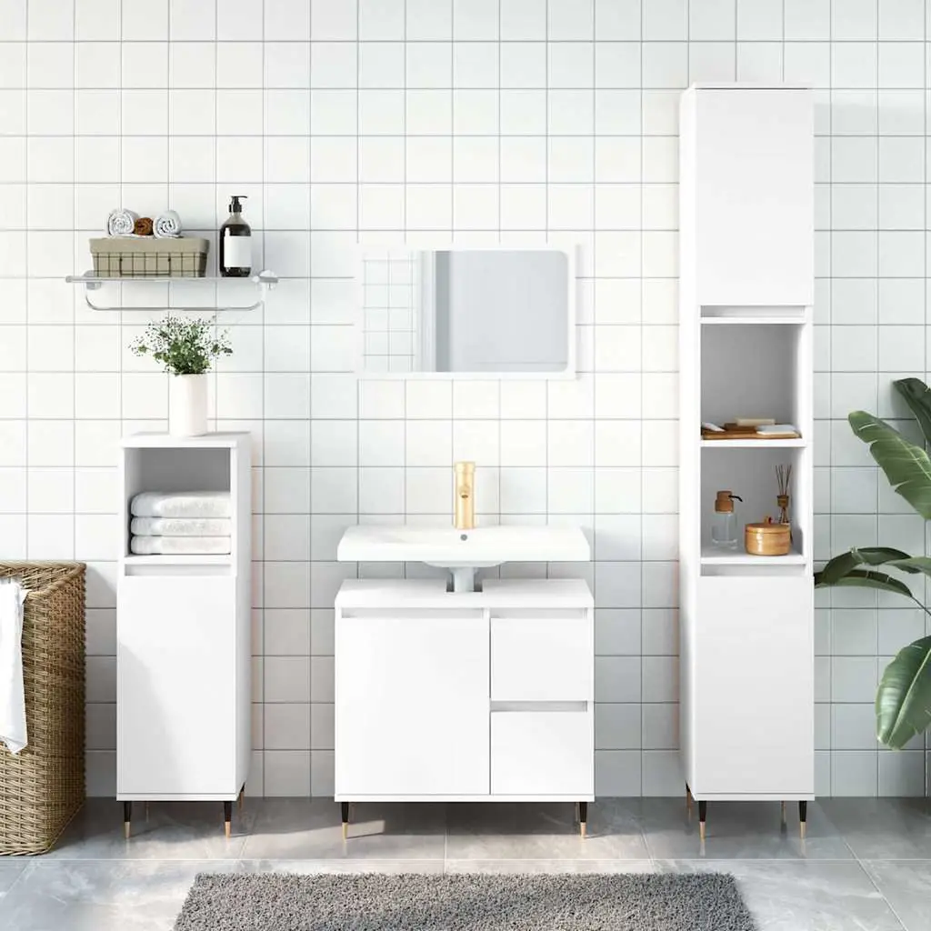 This modern bathroom cabinet really upgrades your bathroom. With its sleek white finish and minimalist design, it combines style and function while keeping all your grooming essentials organized, making it perfect for adults looking for something that looks great and works hard. Spacious and Organized Storage: This cabinet comes with two drawers and a hinged door to neatly store your bathroom essentials. No more messy countertops, as everything has its own spot.Contemporary Aesthetic: Its modern design features smooth lines and a matte white finish that fits in with any bathroom decor, adding a nice touch while being practical.Sturdy Construction: Made from durable engineered wood with metal legs, this cabinet is built to last, reliably holding all your essentials day in and day out.Adjustable Feet for Stability: Thanks to its height-adjustable feet, you can tweak it based on your floor, ensuring it stays steady and fits just right in your bathroom.Easy Maintenance: Keeping this cabinet looking sharp is a breeze. Just a quick wipe down with a soft cloth is all it takes to keep it in top shape.