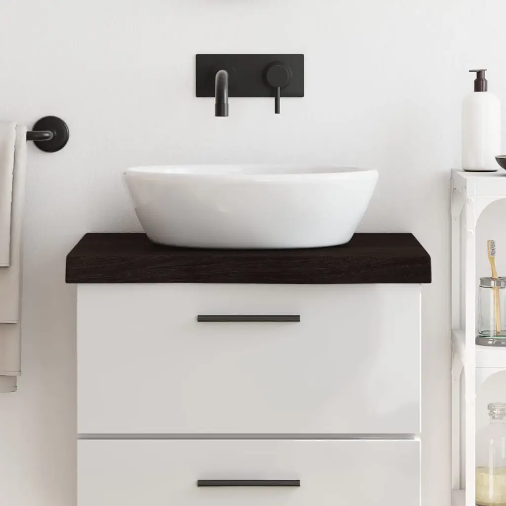Are you planning to renovate your countertops at home? This wooden bathroom countertop is a perfect choice!Durable construction: This bathroom worktop is made of solid oak wood, which is a beautiful natural material. Oak wood has a medium brown colour and a dense grain, contributing to its unique look.Versatile applications: Besides a bathroom vanity top, this wooden countertop can be combined with different bases according to your needs. It can be used as a shelf, cabinet top, desk top, table top etc.Treated surface: The bathroom top has been treated with dark paint, so it is ready for use as an additional finish is not required.Handmade with live edge: This bathroom vanity countertop is handmade with a live edge. Due to that the knots, cracks, slightly curved shapes, and colour tones are part of the oak wood, every piece of oak countertop has its own unique character to display. The delivery is random.Good to know:As a natural product, wood may show knots and imperfections that we fill with black fillings to ensure a smooth appearance.