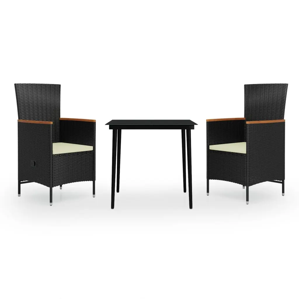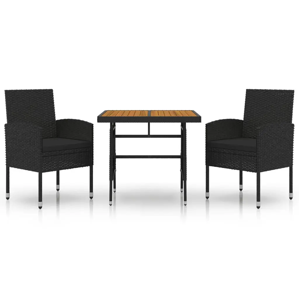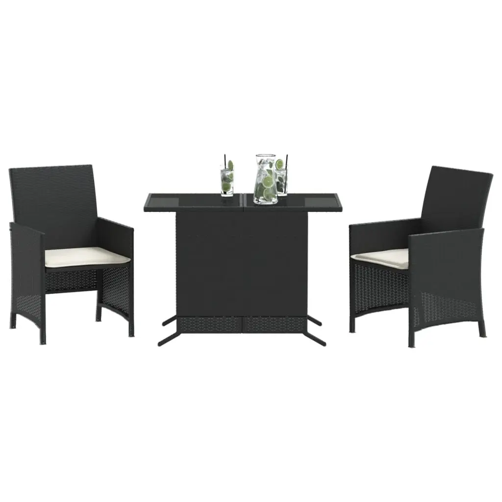 This 3-Piece Bistro Set is all about mixing stylish looks with practicality. It's just right for those intimate outdoor get-togethers or comfy indoor moments. The set features a rectangular table and two comfy chairs, each with removable cushions, all crafted from sleek black poly rattan that just lifts the vibe of balconies, patios, or gardens. UV Resistant Materials: Made from top-quality UV-resistant poly rattan, this bistro set is built to last, keeping its vibrant colors even when the sun’s shining—perfect for outdoor use.Convenient Cushion Care: Not only are the table and chair cushions comfy, but those zippered covers make it easy to wash, keeping things neat and fresh.Compact Size: With compact dimensions, this set is a space-saver. It's just right for small patios or balconies while still seating two comfortably, so you can enjoy your coffee or meals without feeling cramped.Stylish & Modern: Its modern geometric lines and sleek black finish mean this bistro set fits right in with tons of decor styles, enhancing the look of both indoor and outdoor setups.Easy to Store: The stackable chairs help keep things tidy, so when you're not using the set, you can easily tuck it away.