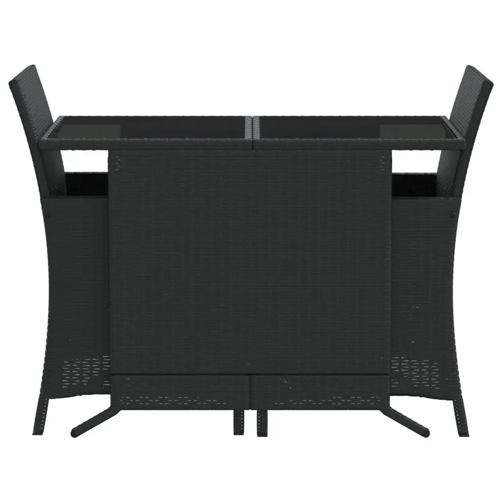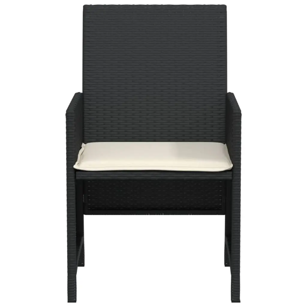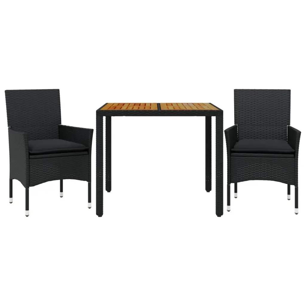 This 3-Piece Bistro Set is all about mixing stylish looks with practicality. It's just right for those intimate outdoor get-togethers or comfy indoor moments. The set features a rectangular table and two comfy chairs, each with removable cushions, all crafted from sleek black poly rattan that just lifts the vibe of balconies, patios, or gardens. UV Resistant Materials: Made from top-quality UV-resistant poly rattan, this bistro set is built to last, keeping its vibrant colors even when the sun’s shining—perfect for outdoor use.Convenient Cushion Care: Not only are the table and chair cushions comfy, but those zippered covers make it easy to wash, keeping things neat and fresh.Compact Size: With compact dimensions, this set is a space-saver. It's just right for small patios or balconies while still seating two comfortably, so you can enjoy your coffee or meals without feeling cramped.Stylish & Modern: Its modern geometric lines and sleek black finish mean this bistro set fits right in with tons of decor styles, enhancing the look of both indoor and outdoor setups.Easy to Store: The stackable chairs help keep things tidy, so when you're not using the set, you can easily tuck it away.