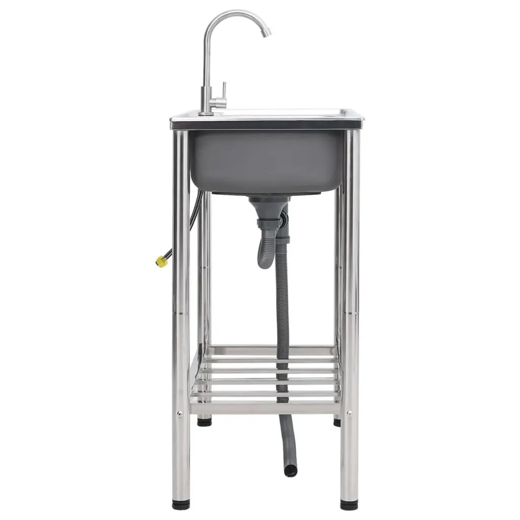 This camping sink has two basins with a drainer and a tap, which is a perfect choice for outdoor use.Made of stainless steel, this garden kitchen withstands scratches and impacts, is highly durable, and safe for food contact. It is also dirt-repellent and stain proof, thus easy to clean. The two extra-deep basins have ample space for washing large pans and dishes. Additionally, the sink is easy to transport.