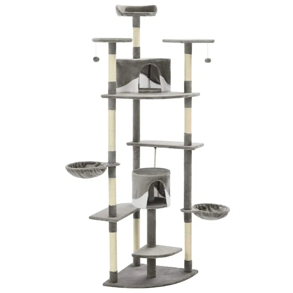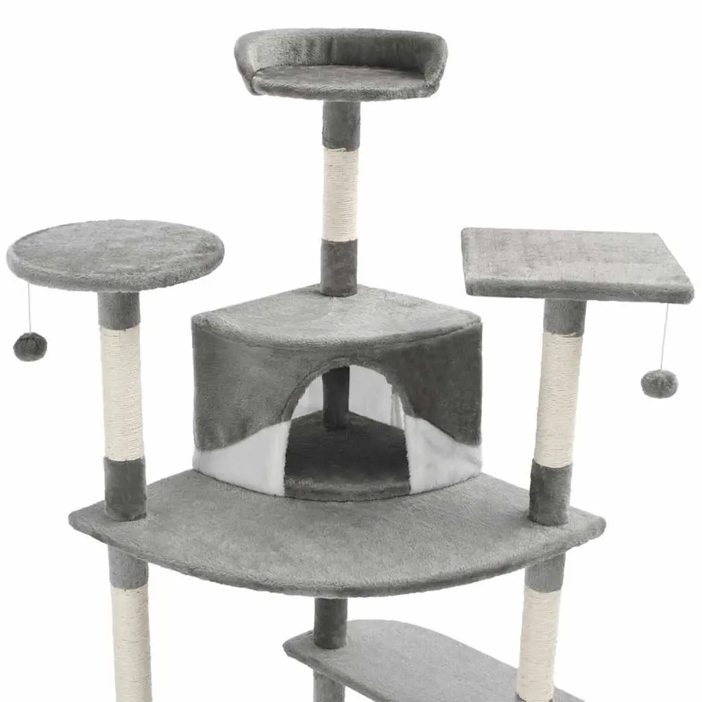 This large cat tree is a nifty playground made for kitty fun, featuring lots of levels and scratching posts that invite playful adventures and comfy lounging. Its sleek grey and white design adds a modern vibe to any living room, while giving your cat a cool place to chill, play, and scratch. Sturdy sisal rope pillars are perfect for your cat to scratch, keeping them busy and protecting your furniture.Two spacious hideaways give your cat a comfy spot to chill, plus multiple platforms for climbing and exploring.With fun dangling toys, this cat tree encourages active play, contributing to your kitty's health and mental stimulation.The anti-slip base ensures stability, so your cat feels safe when jumping between levels or scratching.Easy to set up with just a screwdriver, this cat tree is a must-have for any indoor space.