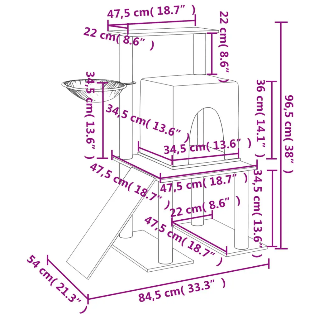 This cat tree is a stylish and practical piece of furniture made for our feline friends, featuring a trendy light grey finish that fits right in with modern home decor. Best for indoors, it’s a multifunctional play area that gets them climbing, scratching, and resting, while keeping your living space neat and looking good. Durability: The cat tree is made with a tough engineered wood frame, ensuring it lasts even with multiple cats giving it a good workout. It’s sturdy enough for them to jump and play without worries of accidents.Interactive Features: With sections that encourage agility and playfulness, this cat tree comes with a soft house, platform, and basket that keep cats both mentally and physically engaged.Scratch-Resistant: The surface is designed to endure scratching, protecting your furniture while providing a dedicated scratching spot for your pet, reducing damage to your home.Spacious Design: The cat tree measures 21.3 in wide, 33.3 in long, and 38.0 in high, offering ample space for various activity levels. It's perfect for medium-sized cats, accommodating them comfortably.Modern Aesthetic: The sleek light grey color and matte finish give it a chic vibe, blending seamlessly into any room, be it the living room or bedroom, adding elegance and function to your home.