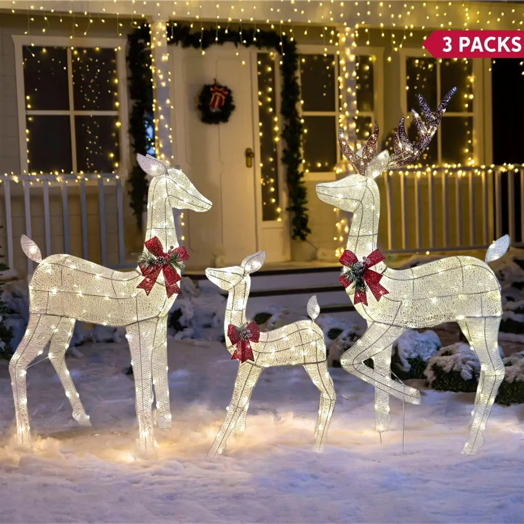 This awesome 4-piece lighted Christmas reindeer set adds a magical touch to any festive setting, whether inside or outside. Made from tough mesh and shiny metal, each reindeer stands 25.2 in tall, spreading charm and cheer with its dynamic LED lighting. Dynamic Lighting: The set features 8 different lighting effects that turn your decor into a lively show. With changing patterns and colors, this lighting sets the mood for both festive gatherings and quiet nights.Versatile Use: Designed for both indoors and outdoors, this reindeer set lifts any atmosphere, from cozy living rooms to beautifully decorated gardens, adding a warm glow to your festive decorations.Stylish Design: With their classic silver finish, these decorative reindeer bring a traditional holiday look that complements all decor styles. Their charming vibe suits both vintage and contemporary themes.Easy Setup: The straightforward plug-in design means quick setup and takedown. Just make sure the USB connection is indoors to enjoy the beautiful light displays.Durable Materials: Made from top-notch mesh and metal, these festive decorations can handle various weather conditions, ensuring they remain a cherished part of your seasonal decor every year.