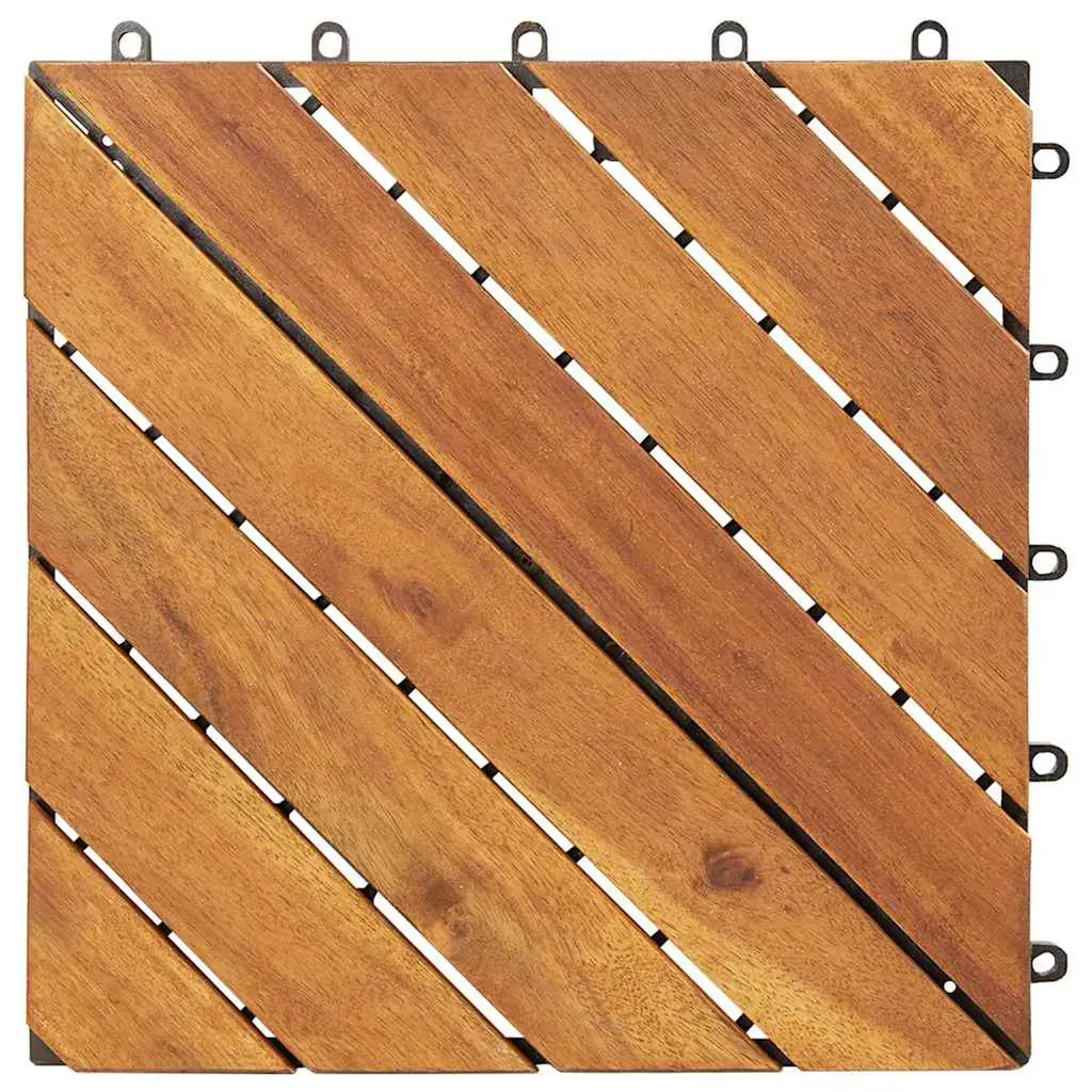 The easy-to-combine wooden decking tiles will be an excellent choice to adorn your patio or garden path.Premium material: Solid acacia wood is a beautiful natural material. Acacia wood is a tropical hardwood, which is dense, sturdy, and durable.Attractive outlook: The stylish design of the floor tiles could easily blend into your living space.Easy to install: Thanks to the plug-in connection, the tiles can be interlocked easily and firmly to form a stable walking surface.