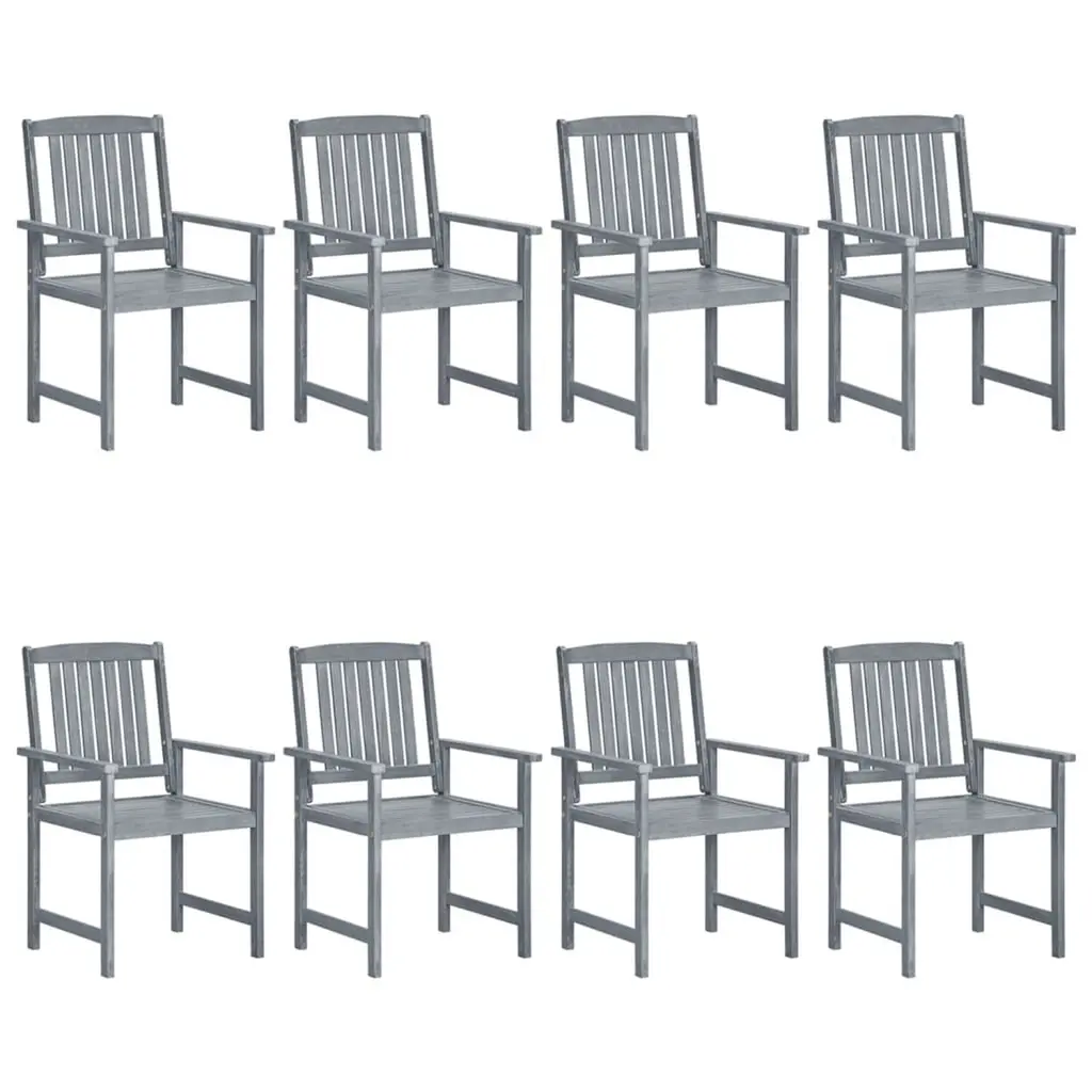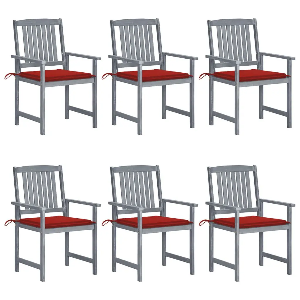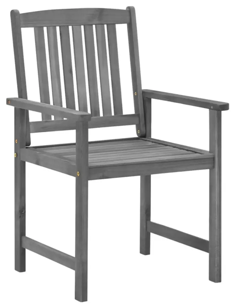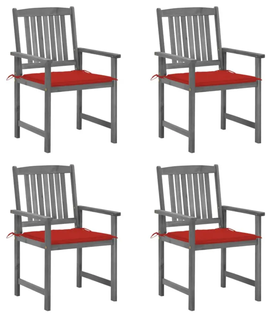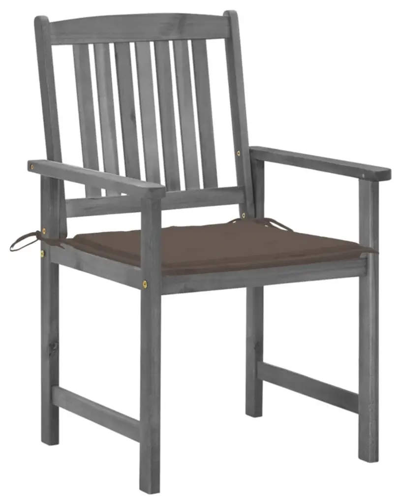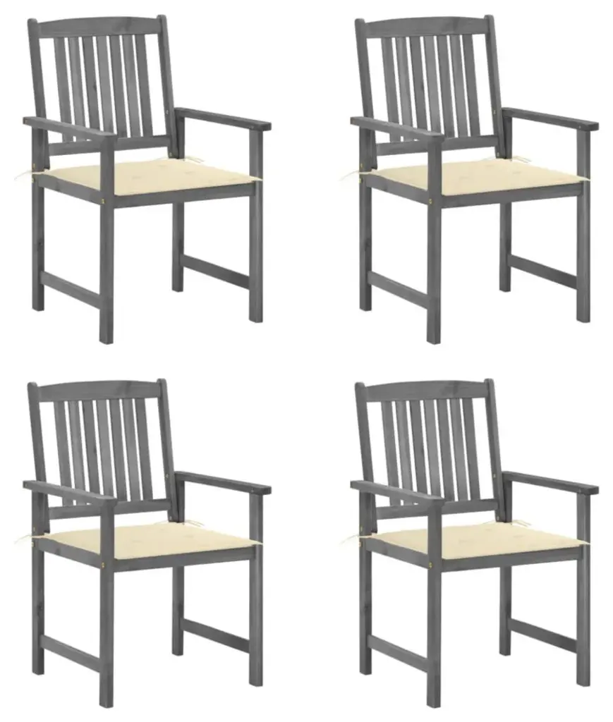 vidaXL Director''s Chairs with Cushions 4 pcs Gray Solid Acacia WoodDecorate your outdoors with these slatted wooden director''s chairs, adding a touch of rustic charm. These garden chairs are made of solid acacia wood, making them sturdy and stable. The cushions add extra comfort. Each cushion features two sets of ropes to fix it on the outdoor chair tightly.Color: GrayColor of cushions: TaupeMaterial: Solid acacia wood with a Gray wash finishMaterial of cushion: Fabric (100% polyester)Overall dimensions: 24" x 22.4" x 36.2" (W x D x H)Seat size: 18.9" x 18.1" (W x D)Seat height from the ground: 17.1"Dimensions of cushion: 19.7" x 19.7" x 1.6" (L x W x T)Assembly required: Yes4 x Chair4 x CushionColor: Grey