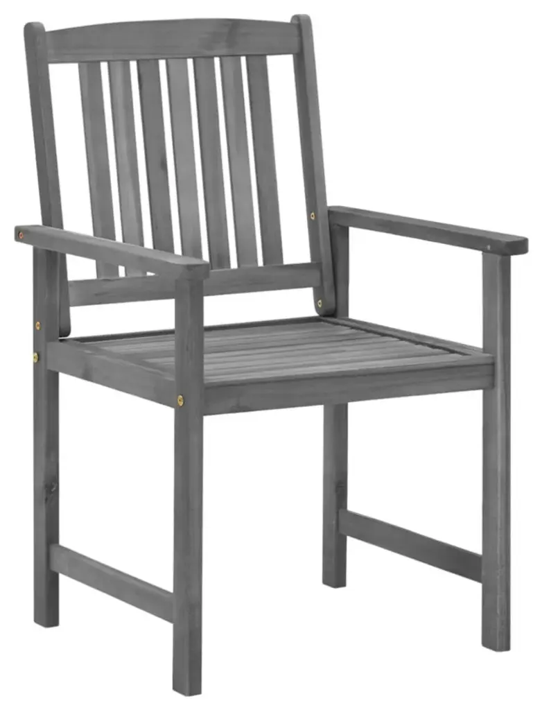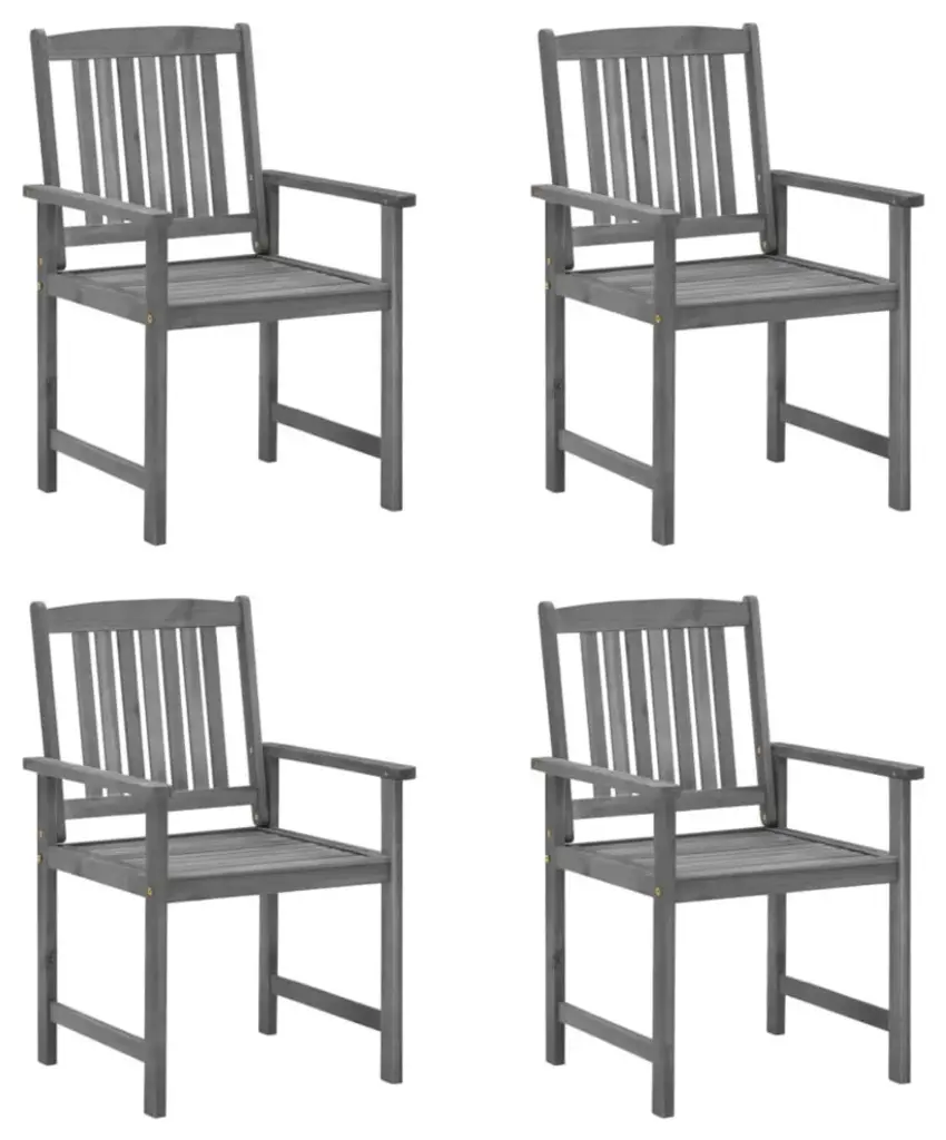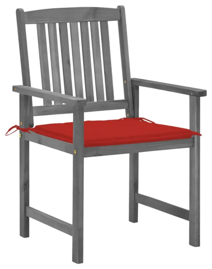 vidaXL Director''s Chairs with Cushions 4 pcs Gray Solid Acacia WoodDecorate your outdoors with these slatted wooden director''s chairs, adding a touch of rustic charm. These garden chairs are made of solid acacia wood, making them sturdy and stable. The cushions add extra comfort. Each cushion features two sets of ropes to fix it on the outdoor chair tightly.Color: GrayColor of cushions: RedMaterial: Solid acacia wood with a Gray wash finishMaterial of cushion: Fabric (100% polyester)Overall dimensions: 24" x 22.4" x 36.2" (W x D x H)Seat size: 18.9" x 18.1" (W x D)Seat height from the ground: 17.1"Dimensions of cushion: 19.7" x 19.7" x 1.6" (L x W x T)Assembly required: Yes4 x Chair4 x CushionColor: Grey