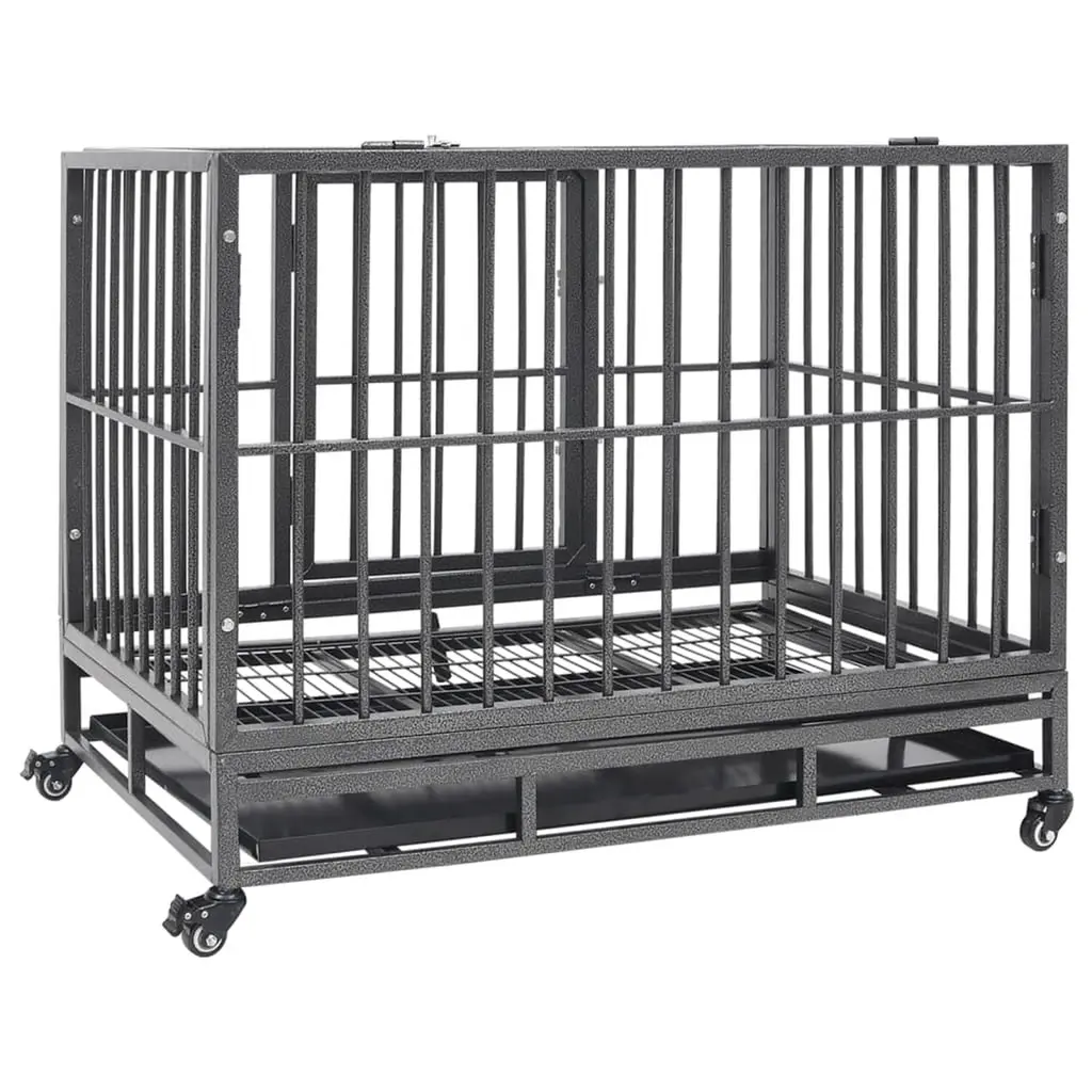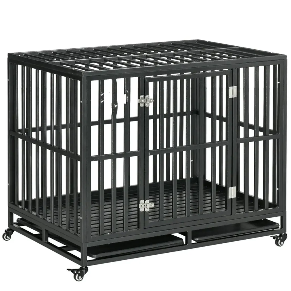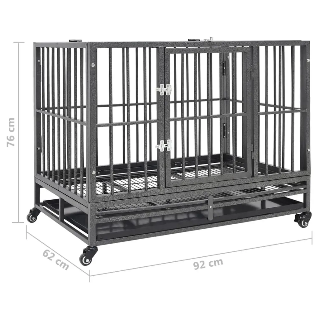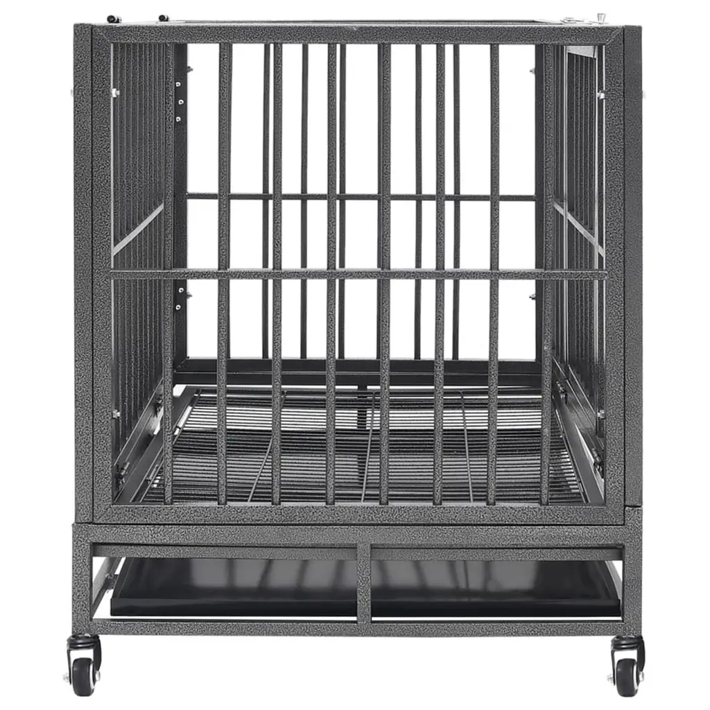 This portable steel dog cage gives your pet a secure and comfy spot, made especially for medium-sized breeds like Bulldogs or Aussie Shepherds. Its modern look with a sleek black and silver finish makes it fit in nicely both indoors and out, so your furry friends can feel safe and stylish at the same time. Mobility: The cage has four wheels, two of which can be locked, so you can move it around easily without worrying about it rolling away during your pet's playtime. Easy Cleaning: With a removable tray, cleaning is quick and simple. Just detach, clean, and pop it back in for a fresh space. Ventilation: The mesh panels are designed for good airflow, keeping your pet comfy and relaxed by maintaining a nice temperature. Durability: Made from tough steel, this cage is built to last and can handle all the roughhousing from even the most playful pets. Escape-Proof: With secure latches, this cage is escape-proof, keeping your pet safe no matter how much they wiggle around.