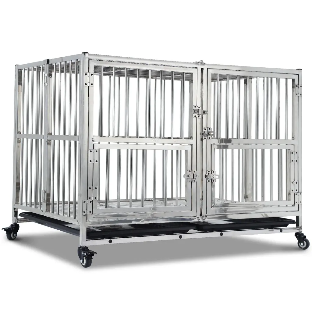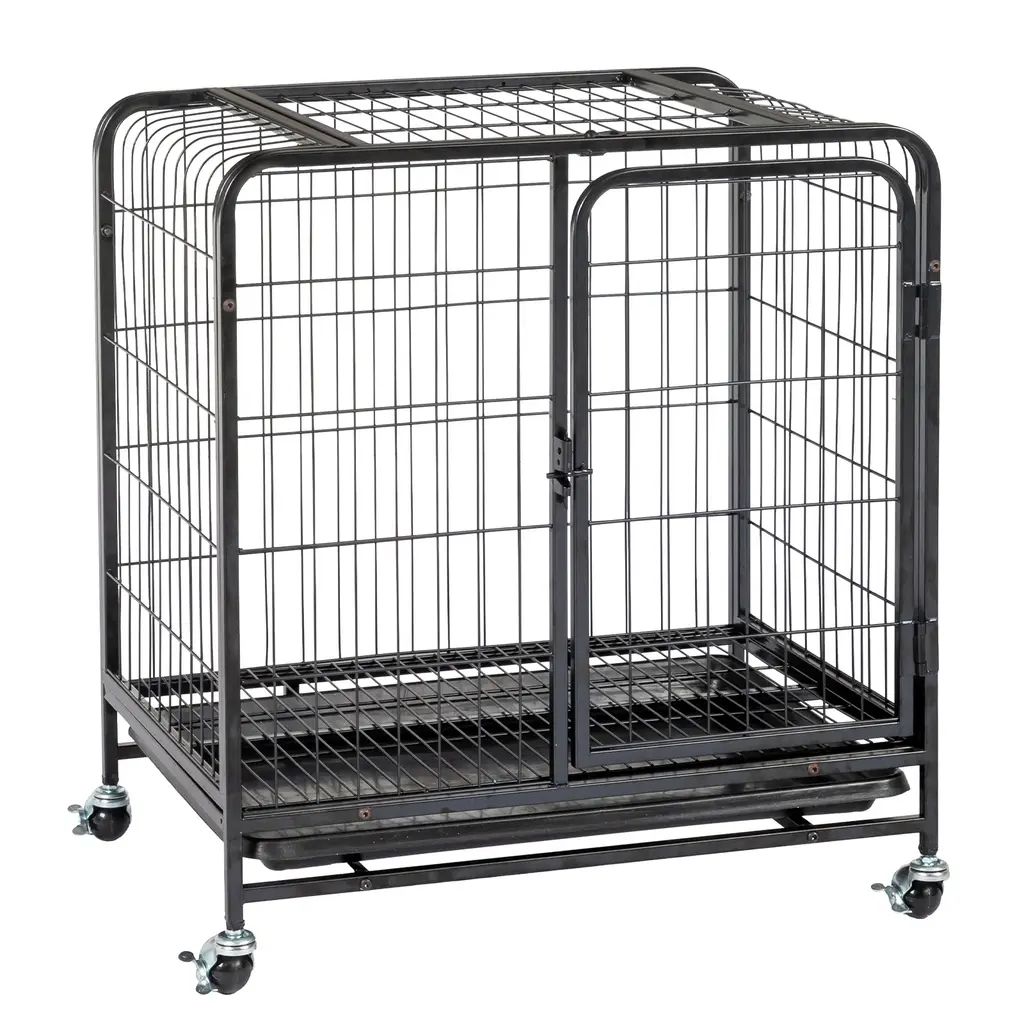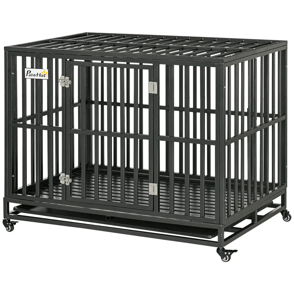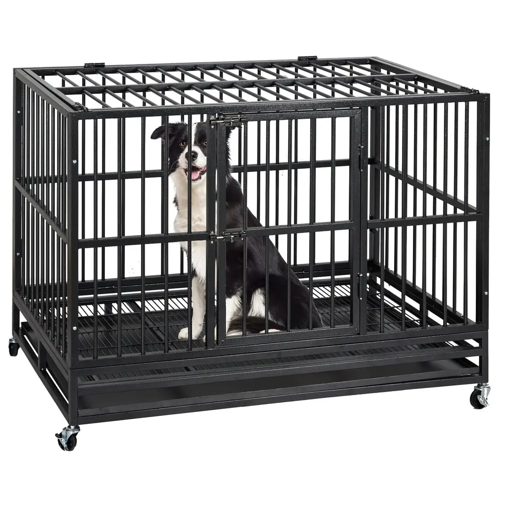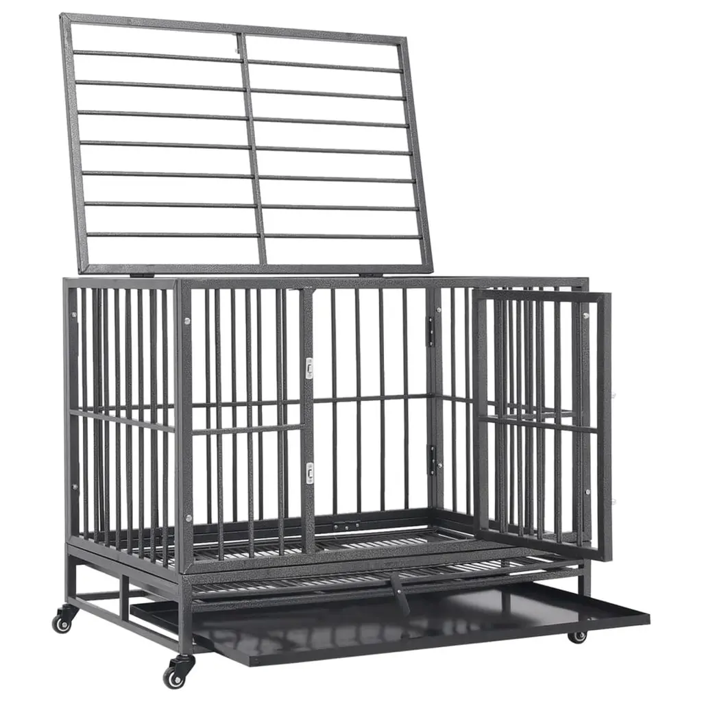 This portable steel dog cage gives your pet a secure and comfy spot, made especially for medium-sized breeds like Bulldogs or Aussie Shepherds. Its modern look with a sleek black and silver finish makes it fit in nicely both indoors and out, so your furry friends can feel safe and stylish at the same time. Mobility: The cage has four wheels, two of which can be locked, so you can move it around easily without worrying about it rolling away during your pet's playtime. Easy Cleaning: With a removable tray, cleaning is quick and simple. Just detach, clean, and pop it back in for a fresh space. Ventilation: The mesh panels are designed for good airflow, keeping your pet comfy and relaxed by maintaining a nice temperature. Durability: Made from tough steel, this cage is built to last and can handle all the roughhousing from even the most playful pets. Escape-Proof: With secure latches, this cage is escape-proof, keeping your pet safe no matter how much they wiggle around.