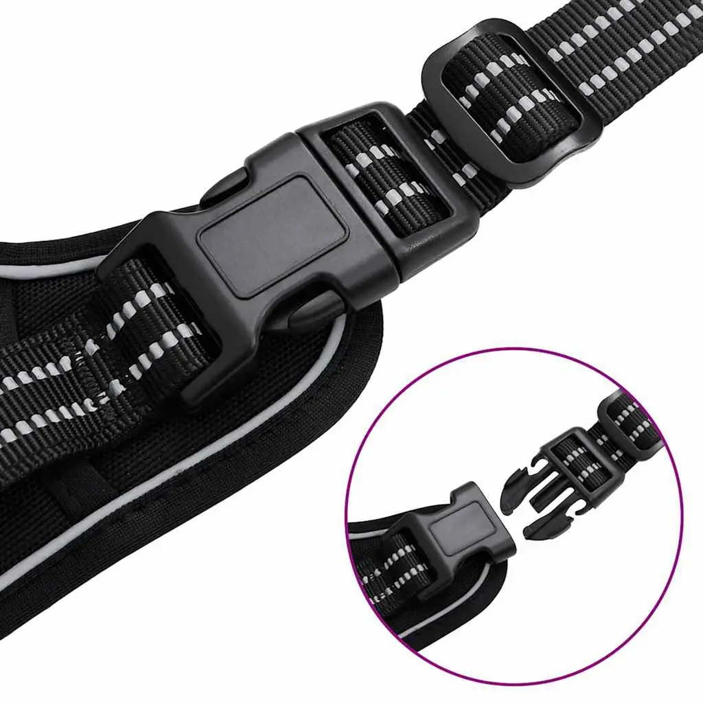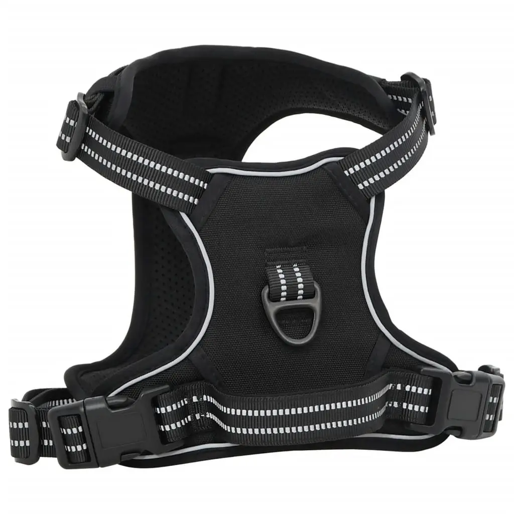 This adjustable black dog harness combines functionality and comfort for your medium-sized breed dogs, like Bulldogs and Border Collies. With padded straps and a durable design, it helps you keep it easy and controlled during outdoor activities and training sessions while making sure your beloved pet is safe and secure. The harness has reflective strips for better visibility in low-light settings, ensuring your pet is safe during evening walks.Made from tough polyester, it’s built to handle everyday use, perfect for active dogs and outdoor fun.The adjustable straps let you get a comfy fit, so it suits different body shapes and keeps your pet secure.This pack includes a strong lead with a 360° rotating safety hook, giving you great control while walking your dog.The whole set comes with a harness, leash, and collar, making it a complete solution for your pet’s outdoor and training needs.