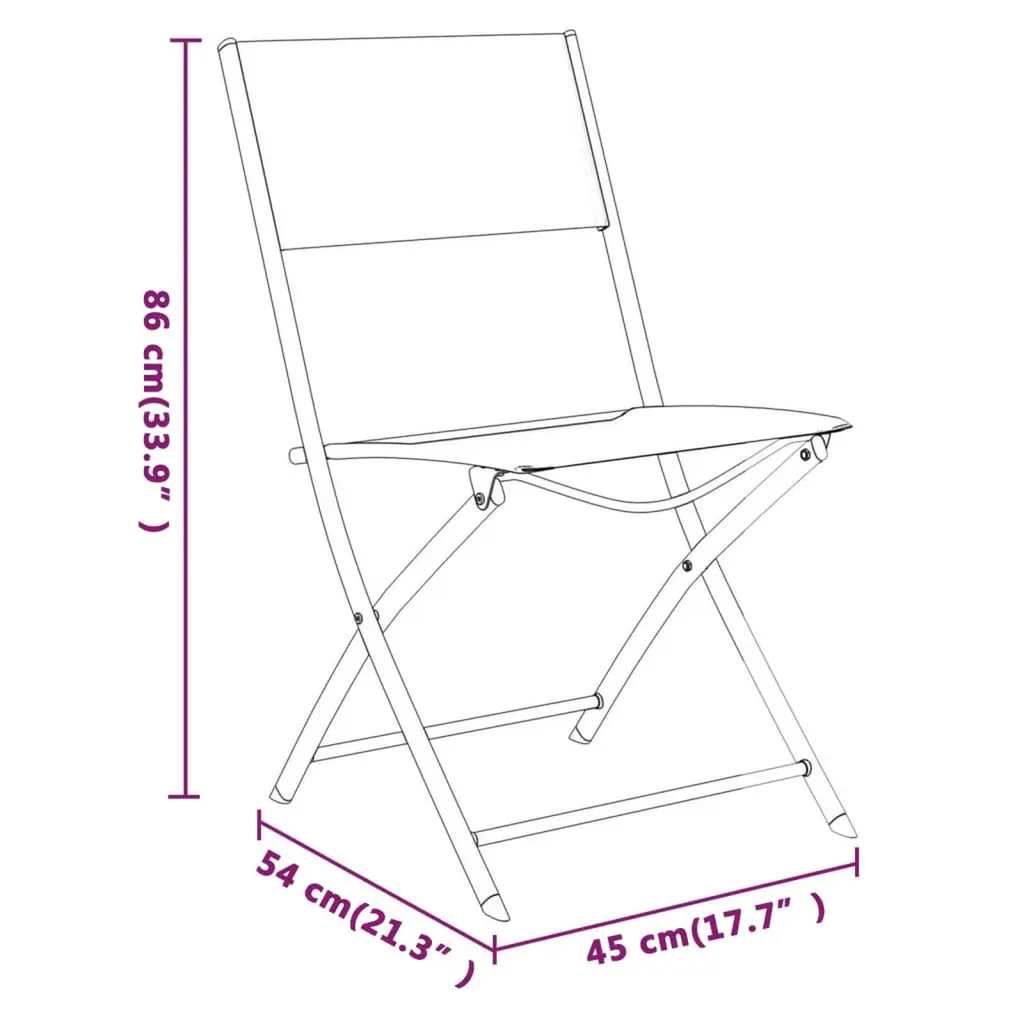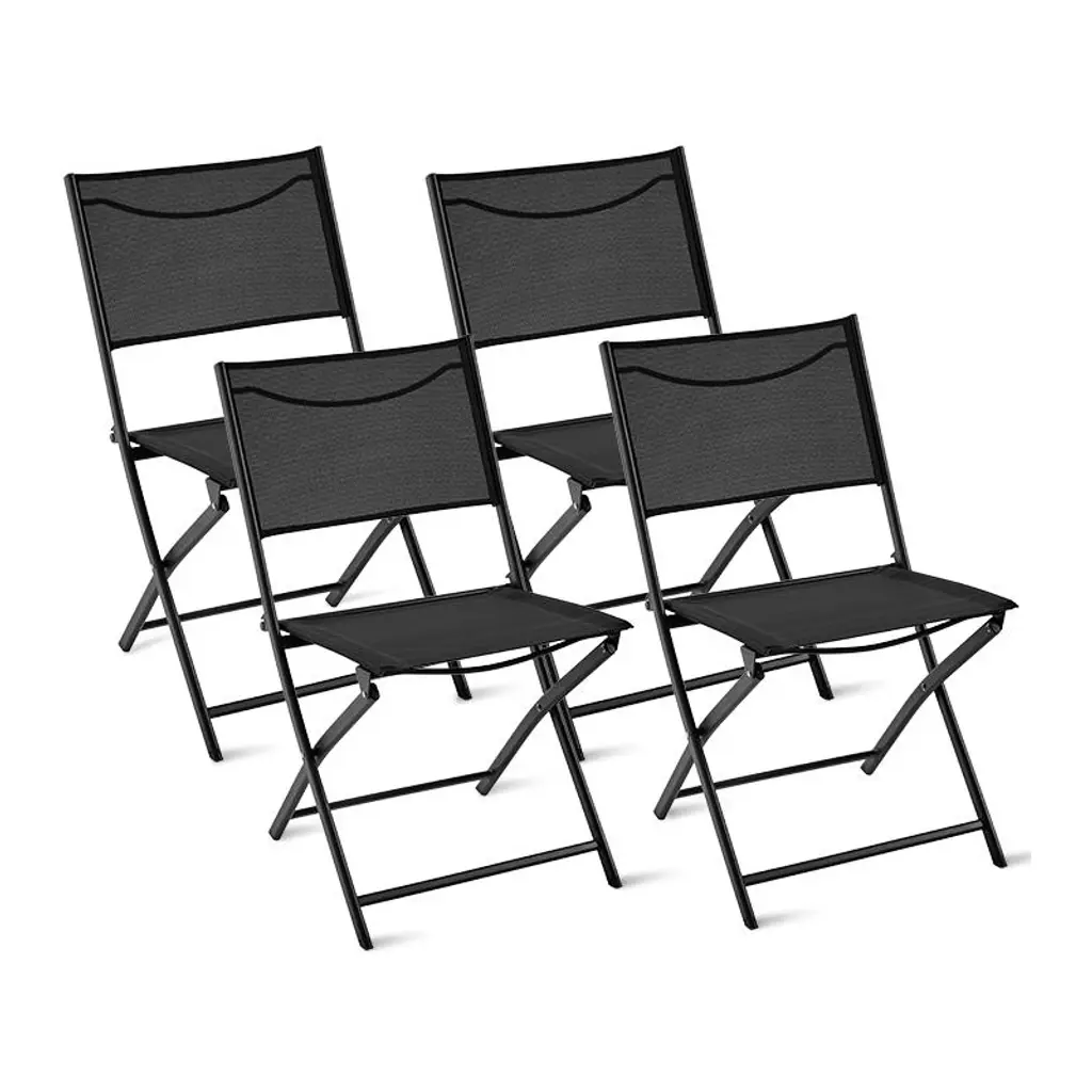 This folding outdoor chair set is all about style and practicality, perfect for both indoors and outdoors. With a sleek black finish, these chairs add a modern vibe, ideally suited for gardens, patios, or balconies, letting you kick back in comfort while taking in the great outdoors. Stylish Aesthetic: With a modern black powder-coated steel frame, these chairs not only look fab but fit right in with a range of outdoor styles. Adjustable Folding Feature: The foldable design makes transport and compact storage a breeze, perfect for spontaneous outdoor events or cozy meals. Durable Construction: Crafted from high-quality textilene fabric and steel, these chairs are stable and comfy, plus resistant to outdoor wear. Ease of Maintenance: Keeping these chairs looking sharp is easy – just give them a quick wipe with a damp cloth. Comfortable Capacity: With a max weight support of 242.5 lbs, these chairs are a comfortable seating option for most adults.