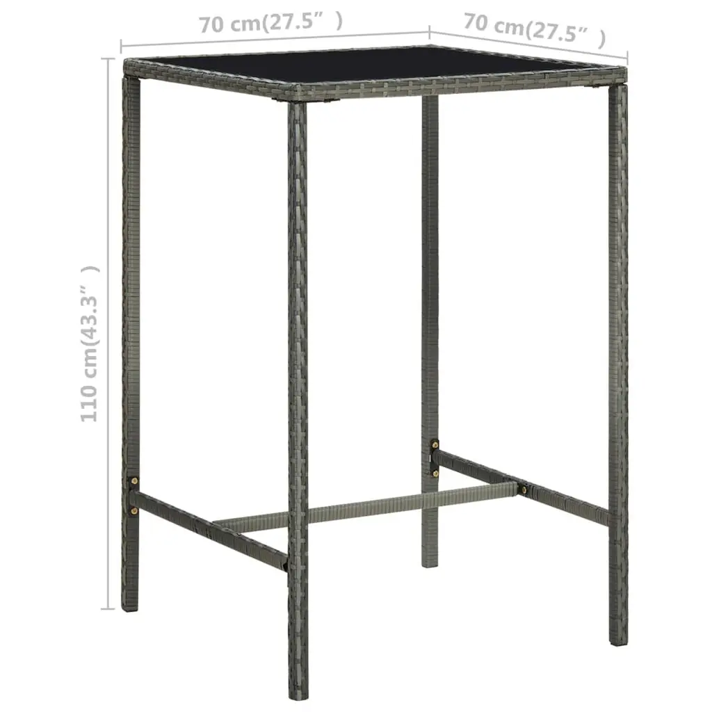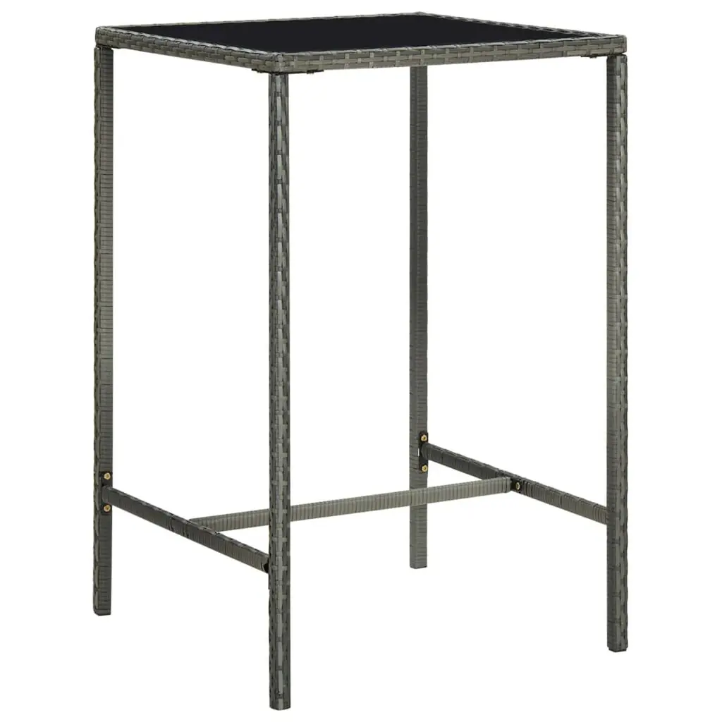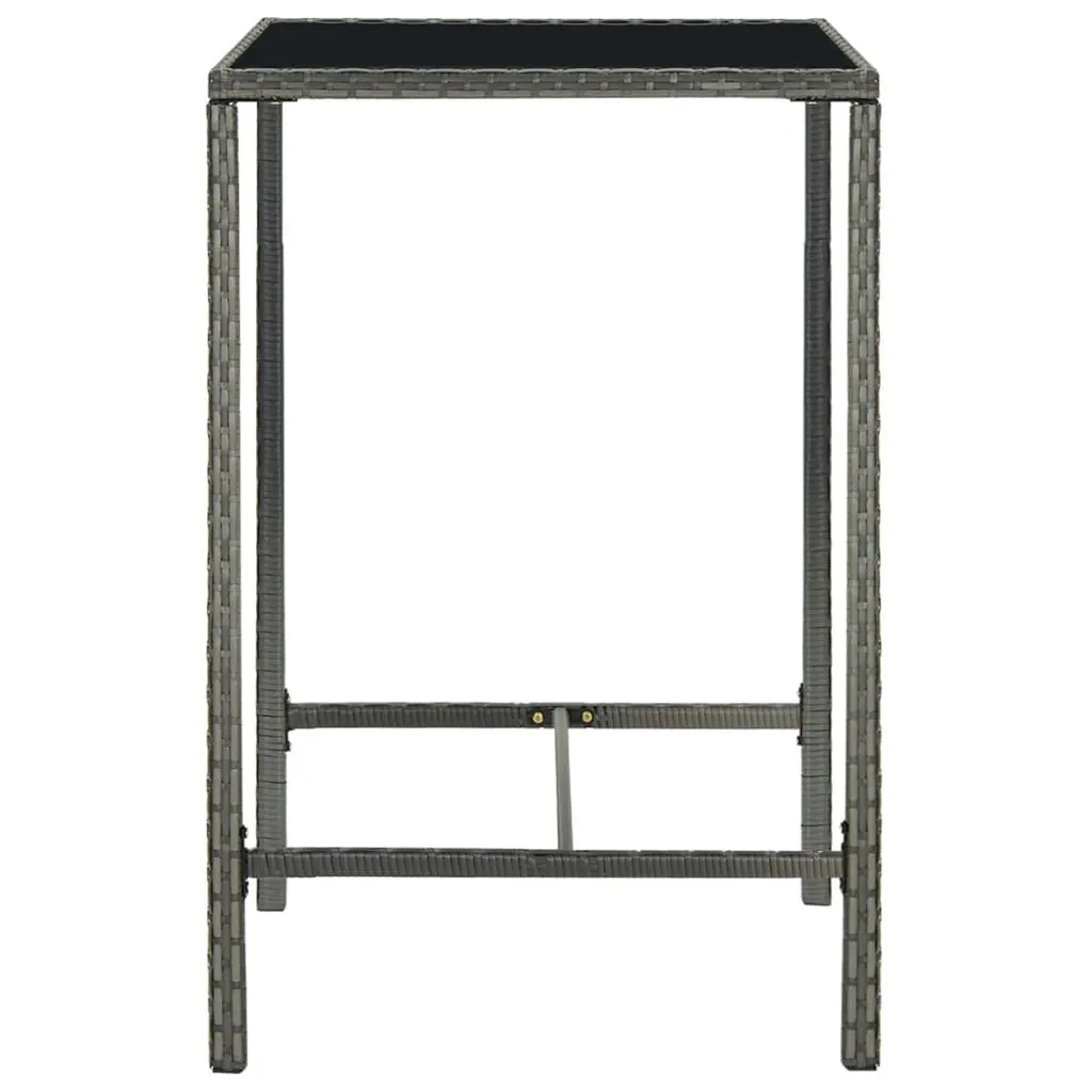 This 5-Piece Modern Garden Bar Set is the ultimate outdoor furniture for any balcony or patio. It's got style and function all wrapped up in a striking design. The set includes a table and four stools, all made from durable, weather-resistant materials. So, you can entertain friends and family comfortably, whether it's a sunny day or under the stars. Sturdy Materials: Built from powder-coated steel and PE rattan, this set is durable and made to stand up to outdoor living.Included Cushions: Comes with removable, water-resistant cushions that are a breeze to clean and provide a combo of comfort and convenience.Elegant Appearance: The sleek grey finish and tempered glass tabletop not only add a touch of class but also enhance your outdoor style.Multi-purposed Seating: Perfect for outdoor dining and cool drinks, this versatile set fits a bunch of different occasions.Compact Design: With its square shape, this garden set slots nicely into smaller spaces, making it easy to style in tight spots.