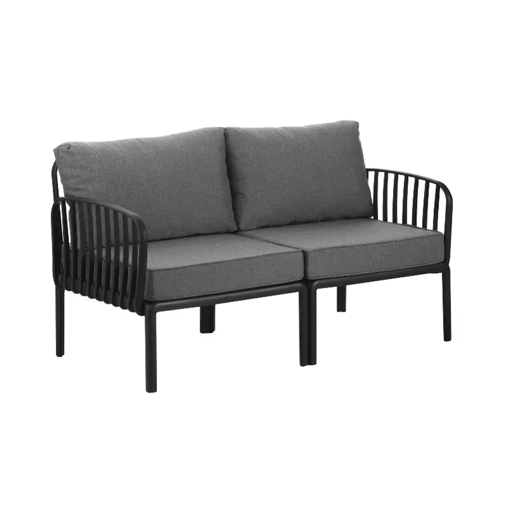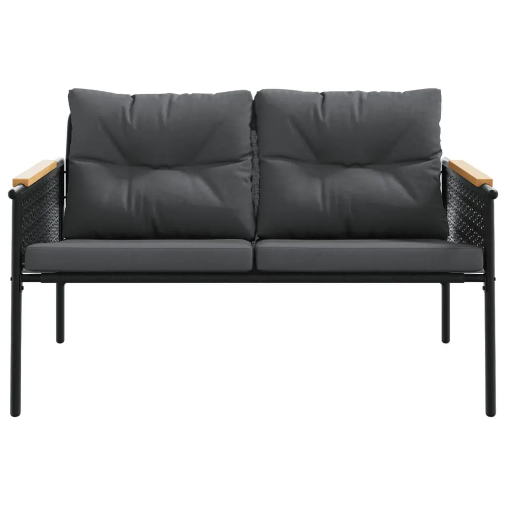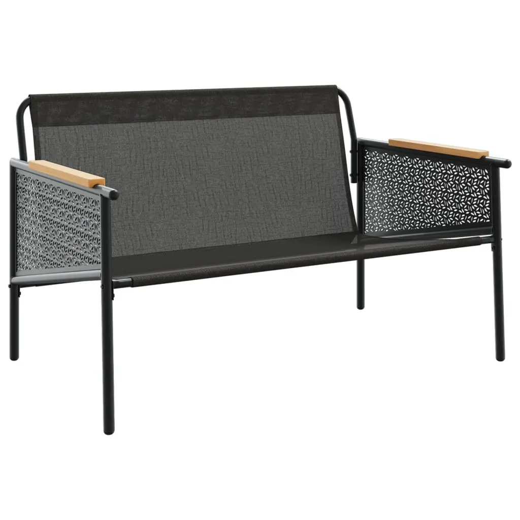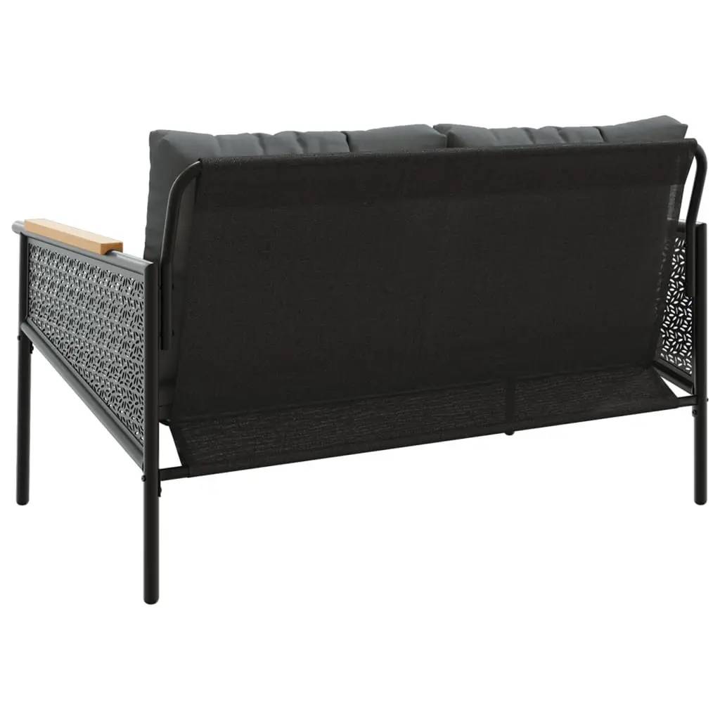 This garden bench is a lovely piece of furniture, perfect for those who enjoy relaxing outdoors. Made with a sleek black powder-coated steel frame and comfy anthracite cushions, it offers both style and comfort for any balcony, patio, or terrace. Imagine family gatherings, quiet moments with a book, or sunny brunches with friends as you sink into this elegant setup that effortlessly combines functionality with modern flair. Stylish and Modern Design: The bench has a contemporary look with clean lines, making it a trendy addition to any outdoor area.Premium Comfort: Padded with high-quality cushions in fade-resistant fabric, ensuring you’re comfy even after a long sit.Durable Construction: Made from tough powder-coated steel to withstand the elements and provide lasting value through years of use.Easy Maintenance: The removable cushion covers are a breeze to clean, keeping it looking fresh and new.Convenient Size: With dimensions that suit small and medium spaces, this bench fits well on any terrace or patio, seating two comfortably.
