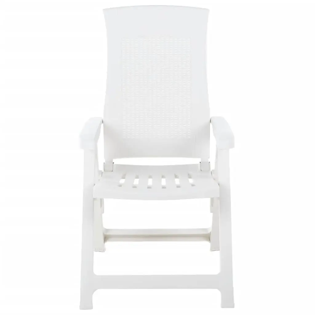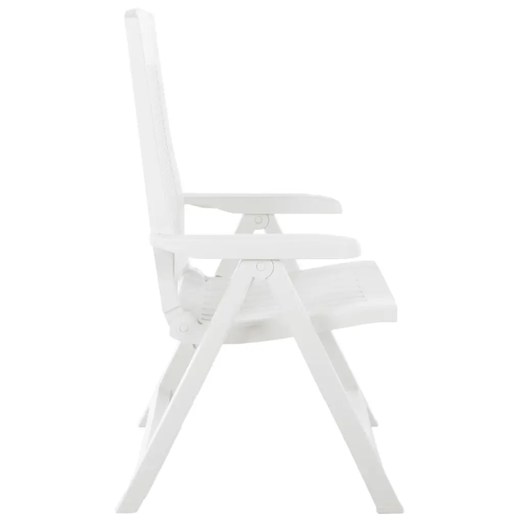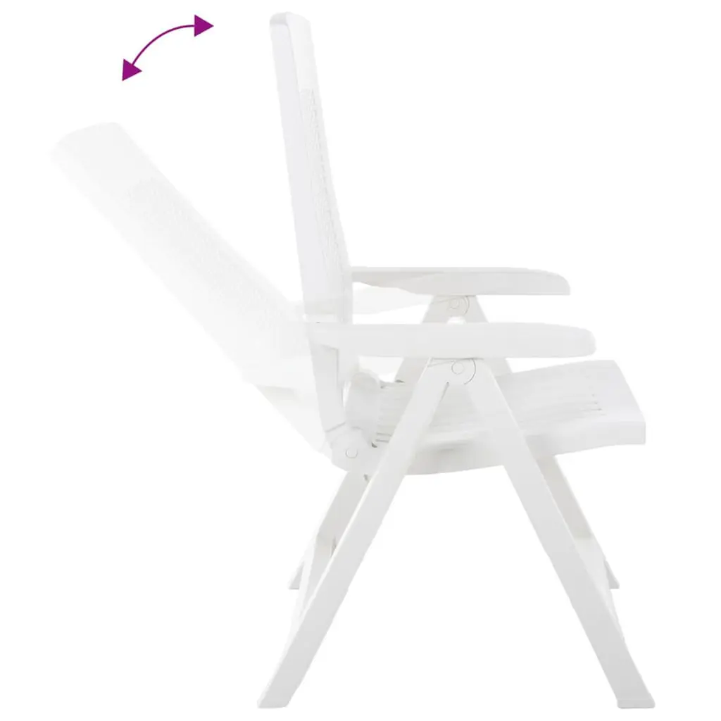 This garden recliner chair set gives you a lovely spot for outdoor relaxation while spicing up your patio or garden. With its chic white look and modern design, these chairs are not just comfy but also elevate the vibe of your outdoor area, making them great for laid-back weekends or quiet evenings. Chic Design: The sleek white shade and smooth finish make these chairs fit right in with a variety of outdoor styles. Their minimalist look blends in stylishly while catching the attention of your guests.Adjustable Armrests: You can easily tweak the armrests to find your own comfy position, making your relaxation even better whether you’re enjoying a drink or diving into a book.Top Comfort: With a backrest that reclines in five different positions, these chairs are built for ultimate comfort, perfect for winding down after a long day.Weather-Resistant: Made from tough plastic, these chairs can handle outdoor conditions, ensuring they last and are easy to take care of while staying light for easy moving.Space-Saving: Their foldable design means you can stash the chairs away when they’re not in use, perfect for small spaces, ensuring convenience and practicality.
