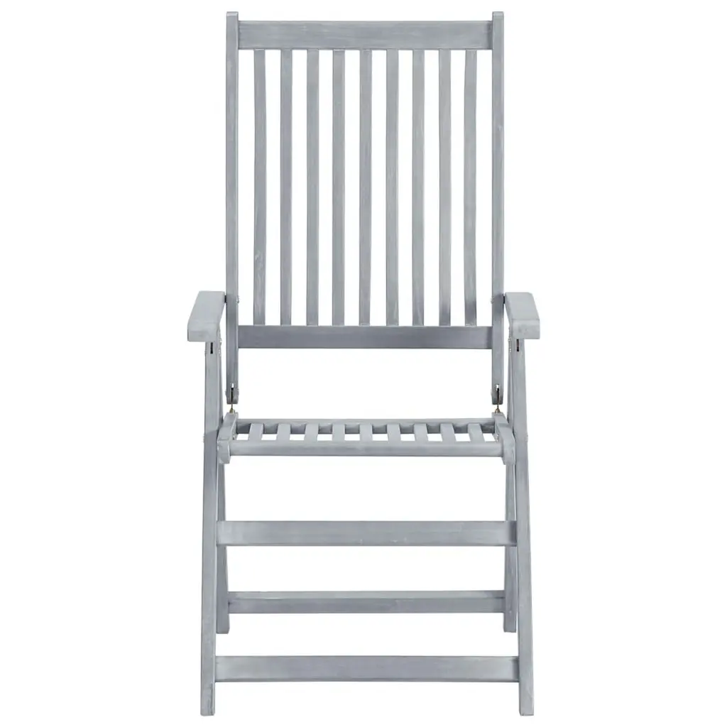 This 6-piece garden reclining chair set is for ultimate relaxation, offering a super blend of style and comfort for outdoor hangouts. Made from solid acacia wood, known for its strength and durability, the chairs have a lovely grey finish that suits any outdoor or indoor decor, making them perfect for gardens, balconies, and terraces. Adjustable Multi-Position Backrest: Enjoy the flexibility of adjusting the backrest to five different angles, letting you find the best position for lounging and relaxing. Perfect for outdoor meals or unwinding with a good book. Solid Acacia Wood: Each chair is made from solid acacia wood, known for being robust and long-lasting. This eco-friendly material not only looks great but also gives solid support. Cushioned Seats: The included cushions feature soft polyester fabric, boosting comfort for long sitting. The cushions have tie closures, making them easy to remove and fasten securely during use. Stylish and Modern Design: These chairs bring a chic vibe to any outdoor setup with their smooth finish and sleek lines, adding a touch of modern sophistication to your garden or patio. Indoor/Outdoor Versatility: Perfect for all sorts of settings; whether you’re hosting an outside dinner or enjoying a peaceful moment in your garden, their stylish look works well for both casual and formal events.
