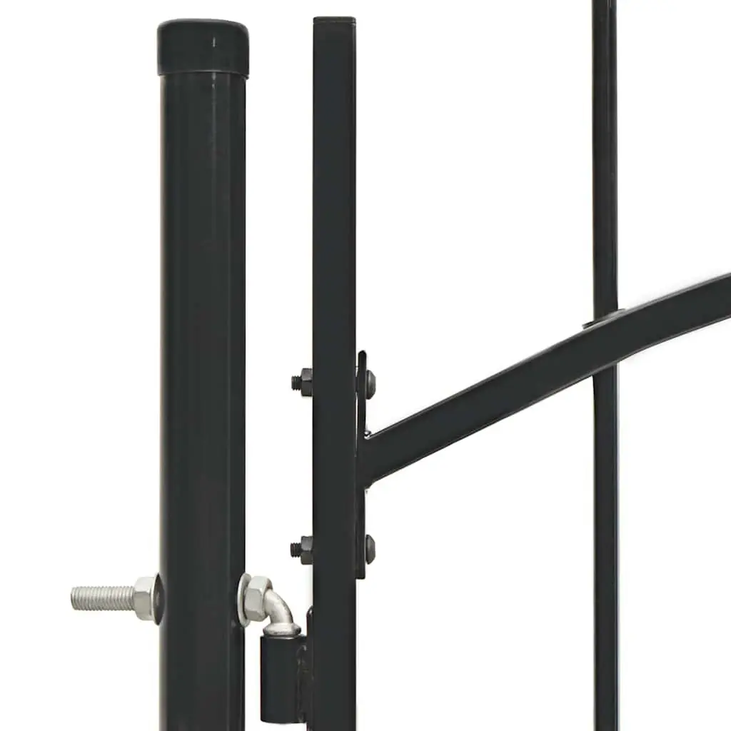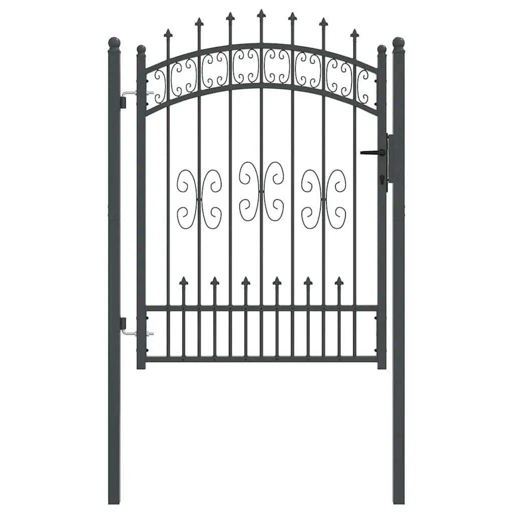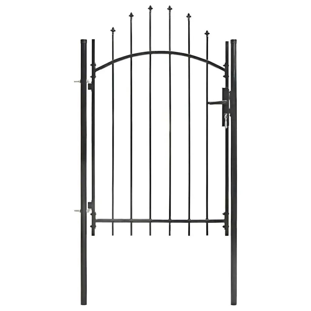 This garden gate will make a contemporarily stylish, practical entryway to seclude your garden from the outside world. Highly stable and durable, the fence gate will form a practical security barrier for your garden, patio or terrace.Thanks to its elegant, arched top design and strong horizontal braces to reinforce the frame, our garden gate will provide a high degree of security, while forming a fabulous entryway onto your property. Manufactured from heavy-duty steel, the gate is powder coated against corrosion. This fence gate is equipped with a locking system and comes with two solid posts along with sturdy hinges for easy installation.This garden gate is an excellent combination of style, strength, stability!