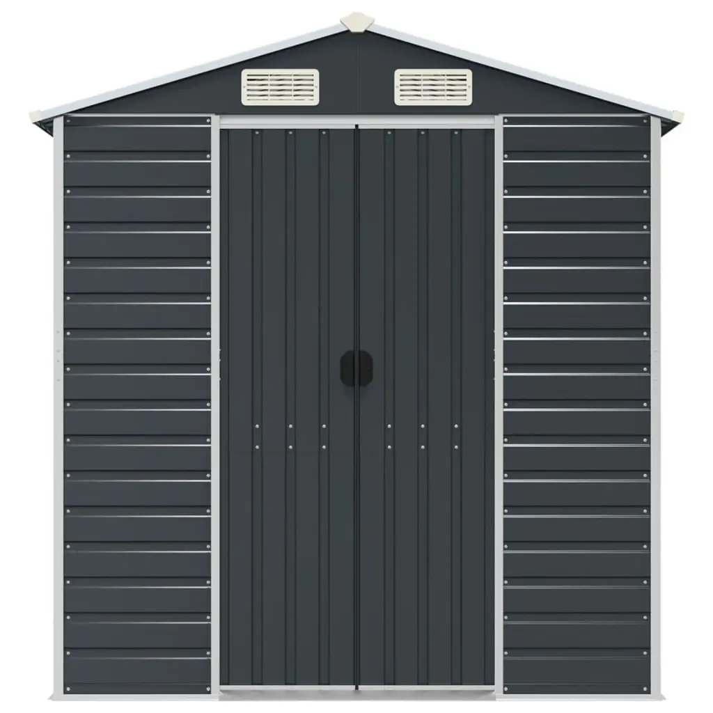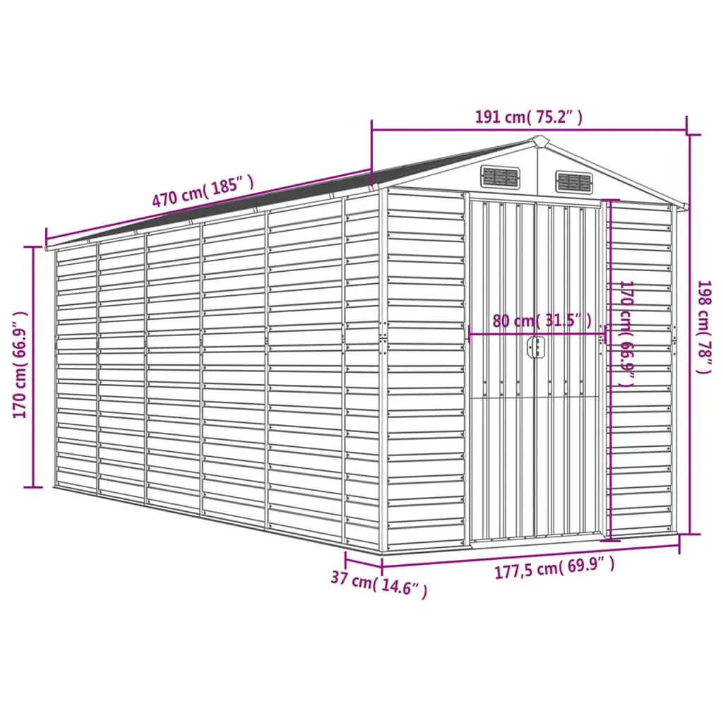This modern garden shed catches the eye with its sleek build, made from tough galvanized steel that holds up to the weather while giving you plenty of storage for all your gardening bits and bobs. The anthracite color looks fab in outdoor settings, whether you pop it in your garden or yard, making it a trendy and functional addition to any place. Ample Storage: With generous dimensions of 75.2 in in length, 185.0 in in width, and 78.0 in in height, this shed offers loads of room for all your gardening stuff. Great for keeping tools neat and freeing up space in your garage.Ventilated Design: The shed's ventilated design helps air circulate, ensuring that whatever you store stays dry and protected from damp. This is key for keeping your gear in good condition and stopping any mildew.Heavy-Duty Construction: Made from high-quality galvanized steel, this shed securely holds heavier items without wobbling. Its sturdy build means it's here for the long haul, making it a smart buy.Powder-Coated Finish: The powder-coated finish not only gives it a stylish look but also resists UV rays and fading, keeping the shed fresh for a long time. This finish also makes it tougher against rough weather.Sliding Bolt Locks: The sliding bolt locks give added security and easy access, making sure your stuff is safe from prying hands while allowing for hassle-free opening and closing.