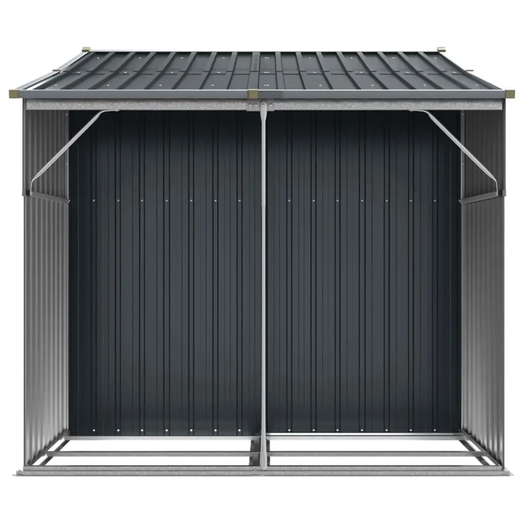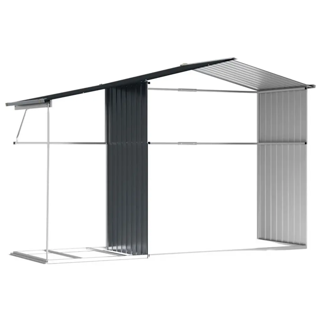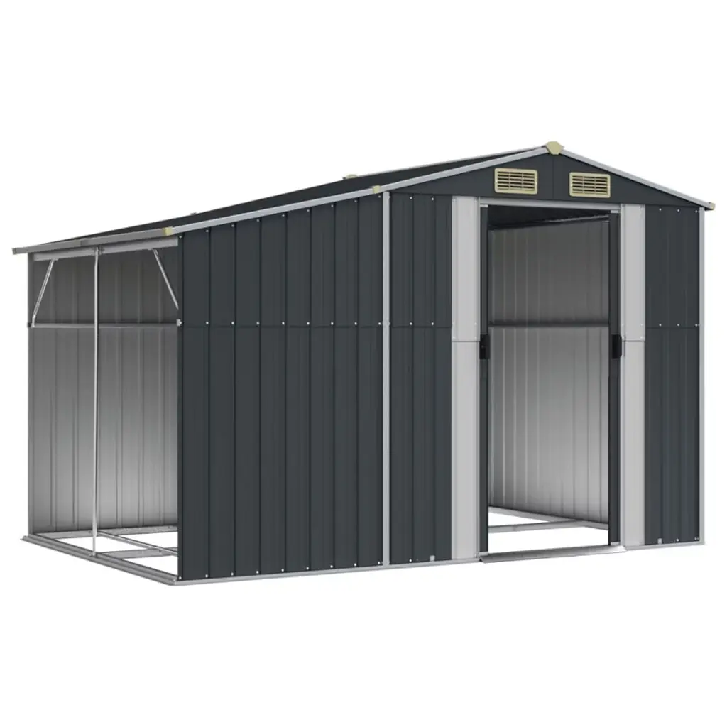 This garden shed blends style and practicality, making it a fantastic addition to any outdoor area. With generous dimensions and multiple size and color options, it provides plenty of space for gardening tools, equipment, and outdoor essentials, all while fitting nicely into a modern setting.Available Sizes and Colors• Sizes: 109.1" x 75.8" x 70.5", 109.1" x 109.8" x 70.5", 277 x 107 x 179 cm• Colors: Anthracite, Light brownSpacious Storage Solution• Ample room for tools, gear, and outdoor equipment• Keeps your garden organized and clutter-free• Spacious interior for easy access and storageDurable Construction• Made from galvanized steel for long-lasting durability• Rust-resistant finish stands up to rain and sun• Powder-coated and galvanized options for extra protectionVentilation and Modern Design• Four air vents help maintain airflow and reduce moisture• Modern rectangular shape with clean lines and minimalist appeal• Fits seamlessly into contemporary outdoor spacesEasy Assembly• Includes straightforward assembly instructions• Requires only basic tools to set up• All necessary parts and hardware includedAdditional Features• Double doors with secure handles for easy entry• Optional firewood stand for added storage versatility (on select models)• Weight: Approximately 98.63–101.79 lbs, depending on size• SKU: 3188292, 3188293, 3188298, 3188299, 364518, 364522This shed is designed for outdoor use only and is perfect for garages, gardens, and other outdoor spaces. Enjoy a smart, stylish, and practical storage solution for all your outdoor needs.