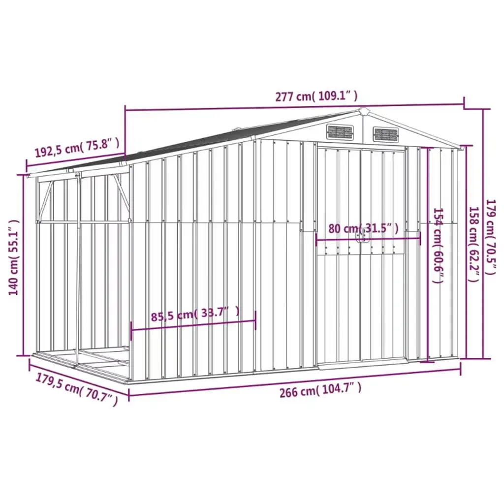 This garden shed blends style and practicality, making it a fantastic addition to any outdoor area. With generous dimensions and multiple size and color options, it provides plenty of space for gardening tools, equipment, and outdoor essentials, all while fitting nicely into a modern setting.Available Sizes and Colors• Sizes: 109.1" x 75.8" x 70.5", 109.1" x 109.8" x 70.5", 277 x 107 x 179 cm• Colors: Anthracite, Light brownSpacious Storage Solution• Ample room for tools, gear, and outdoor equipment• Keeps your garden organized and clutter-free• Spacious interior for easy access and storageDurable Construction• Made from galvanized steel for long-lasting durability• Rust-resistant finish stands up to rain and sun• Powder-coated and galvanized options for extra protectionVentilation and Modern Design• Four air vents help maintain airflow and reduce moisture• Modern rectangular shape with clean lines and minimalist appeal• Fits seamlessly into contemporary outdoor spacesEasy Assembly• Includes straightforward assembly instructions• Requires only basic tools to set up• All necessary parts and hardware includedAdditional Features• Double doors with secure handles for easy entry• Optional firewood stand for added storage versatility (on select models)• Weight: Approximately 98.63–101.79 lbs, depending on size• SKU: 3188292, 3188293, 3188298, 3188299, 364518, 364522This shed is designed for outdoor use only and is perfect for garages, gardens, and other outdoor spaces. Enjoy a smart, stylish, and practical storage solution for all your outdoor needs.