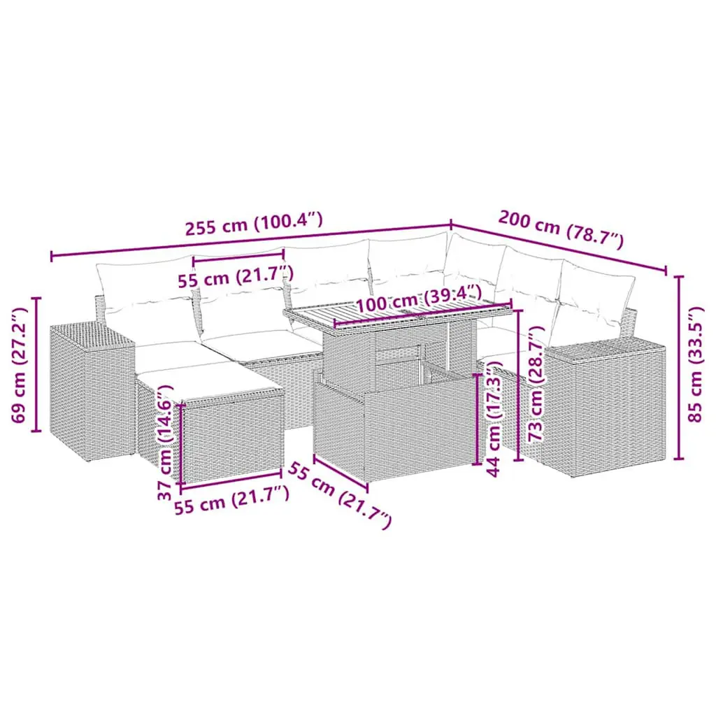 This 8-piece garden sofa set is all about enjoying the outdoors, blending style and comfort for various gatherings and meals. It's built from tough poly rattan and solid acacia wood, creating an inviting space that works well for patios, balconies, and gardens. Versatile Design: The adjustable tabletop can switch from coffee to dining height, perfect for various needs. Whether you’re having a casual coffee or a meal, this feature enhances your outdoor experience.Spacious Seating: With space for up to eight people, this set ensures everyone can join in on the fun, making it ideal for family gatherings or entertaining friends.Durable Materials: Made from UV and water-resistant materials, this sofa set is built to last while staying stylish, fitting for different outdoor conditions.Comfortable Cushions: Each seat comes with soft cushions that have removable and washable covers, providing comfort and making upkeep simple.Stylish Appeal: The set showcases a modern look with a powder-coated frame that stylishly upgrades your outdoor area.