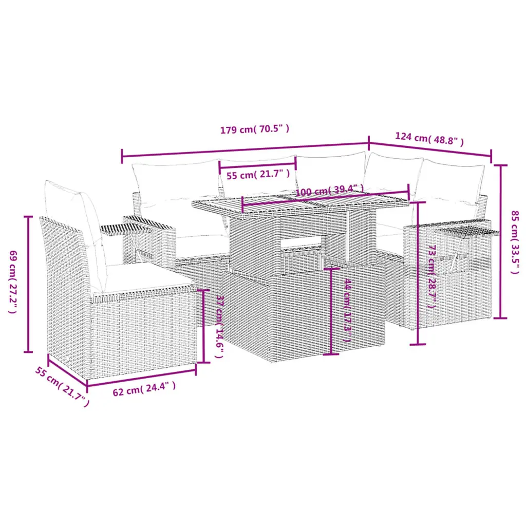 This 6 Piece Garden Sofa Set is a superb blend of modern design and functionality, perfect for outdoor relaxation and entertainment. Made from durable PE rattan with powder-coated steel, it looks stylish yet tough, making it great for gardens, patios, and balconies. It creates a welcoming spot for family and friends to chill and enjoy laid-back afternoons. Versatile Modular Design: The modular nature allows this set to be arranged in various configurations, so you can set up your lounge area to fit your space and style. Weather-Resistant Materials: Made from UV-resistant synthetic rattan and strong powder-coated steel, this garden set is built to last against the elements. Comfy Cushions: Each seat comes with soft cushions covered in polyester fabric that can be easily removed for washing, adding convenience and comfort. Chic Finish: The solid acacia wood table has an oiled finish, showcasing its natural wood grain, making it a visual treat in any outdoor area. Spacious Seating: With room for 6 people, this garden sofa set is perfect for hosting, and the included cushions provide extra comfort for longer lounging sessions.