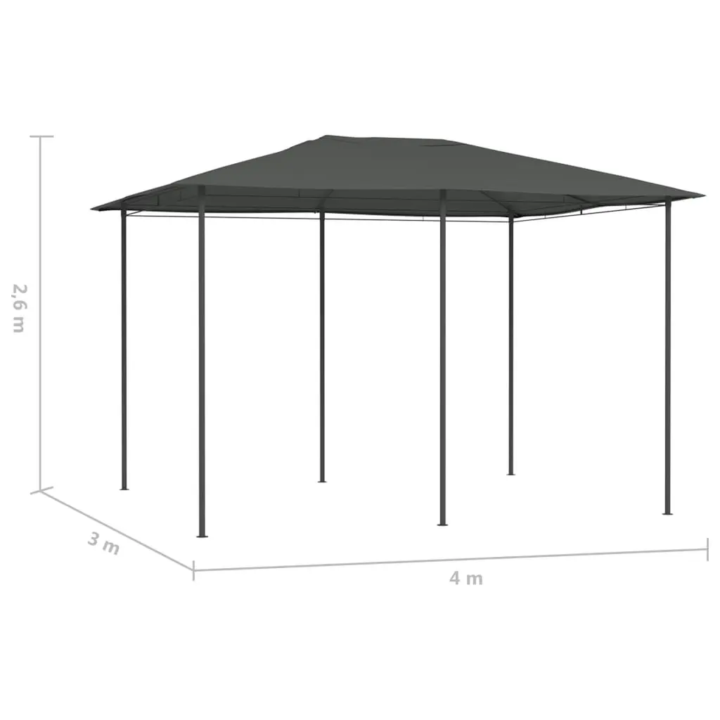 This 3x4 meter outdoor gazebo canopy is the perfect addition to any outdoor space, offering a modern design while providing essential shelter from sun and rain. Its elegant anthracite color and substantial size make it an ideal choice for gatherings, events, and enjoying leisure time in your garden or on your balcony. Weather Protection: Crafted to shield you from harsh sunlight and unexpected downpours, this gazebo ensures your outdoor activities remain fun. The UV-resistant fabric keeps harmful rays away, so you can enjoy the outdoors all day long.Spacious Design: At 9.8 by 13.1 feet, this gazebo can easily fit gatherings of up to 15 people, making it a great choice for parties or relaxed meet-ups.Durable Materials: Built with sturdy steel and solid fabric, this gazebo is made to last. The matte finish adds to its charm while keeping it tough enough for outdoor use.Easy Assembly: Quick and easy to put together, this gazebo can be set up with just a screwdriver and spanner, needing two people to help.Modern Aesthetic: The sleek lines and contemporary anthracite color of the gazebo brighten up any outdoor area, fitting in well as both a practical shelter and a stylish piece of decor.
