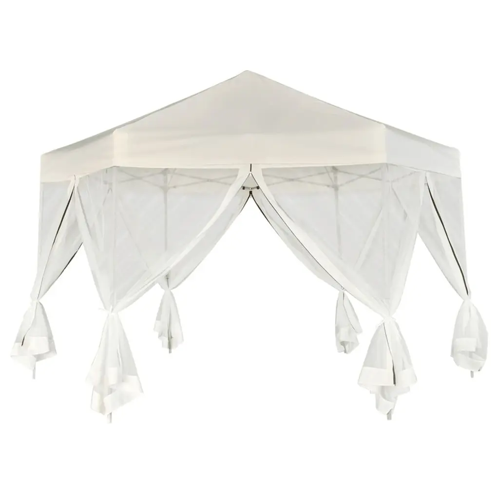 This hexagonal gazebo is a stylish outdoor structure made for all sorts of events like weddings, parties, and family get-togethers. It offers a classy yet practical shade solution. With its cream white fabric and smooth finish, the gazebo boosts the look of any backyard or party scene, so everyone can enjoy the nice weather while being comfortably out of the elements. Climate Control: The mesh sidewalls let air flow through, keeping it comfy when it’s warm and keeping insects out.Durable Materials: Made from polyester with a PA coating, this gazebo resists water, so your event can go on despite light rain.Versatile Usage: Perfect for summer, fall, and wedding seasons, this gazebo suits all sorts of outdoor settings, from small get-togethers to bigger parties.Portable Design: The foldable structure makes it easy to carry and put away, making it a must-have for outdoor entertaining.Easy Maintenance: With simple cleaning tips, this gazebo can keep looking great for quite a few seasons.