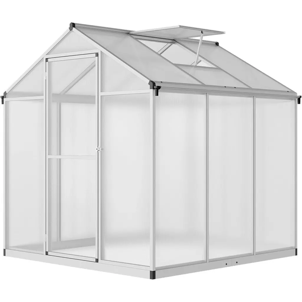 This spacious polycarbonate greenhouse is a must-have for garden lovers wanting to extend their planting season. Its sleek design features a silver aluminum frame and clear panels, allowing plenty of sunlight while shielding your plants from harsh weather. The greenhouse has UV-resistant materials that offer long-lasting protection against sun damage, letting you grow plants without worrying about wear and tear. With its stylish silver and clear look, this greenhouse fits right into any garden, adding a dash of modern flair while being super durable. The manual tilt mechanism provides adjustable ventilation, helping manage temperature and humidity for a healthy plant environment. A built-in gutter system for great rainwater drainage boosts this greenhouse's usability, efficiently directing water away to protect your plant beds. This greenhouse is perfect for protecting garden and outdoor plants, giving you a reliable space to nurture your fav plants or kick off new gardening projects.