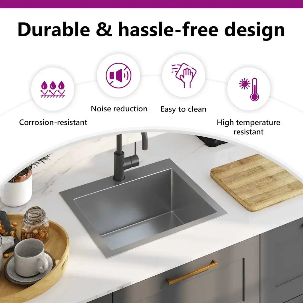 Enjoy the advantage of this kitchen sink with clean contemporary designs. The bowl in silky smooth satin finish will ooze class and sophistication, which will fit any kitchen decor!Combing the best in function and design, this sink is crafted of high-graded handmade stainless steel in anti-condensation paint and lead free. It is sound proofing with the sound-reduction pads. Additionally, the bowl with a unique X-flume design facilitates quick flow, preventing standing water in the bottom of the basin.The sink can be fitted as undermount, flush mount and drop in and you can have it in any way you prefer.