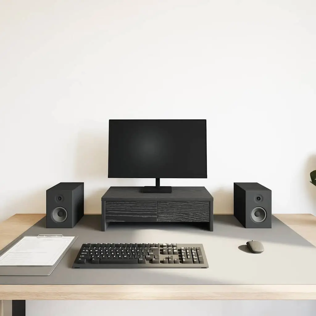 Enhance your workspace with this practical dual monitor stand for better viewing comfort and style.Stable and durable material: Engineered wood is a durable and stable material with a smooth surface that is resistant to moisture, warping, and splitting, making it a reliable choice for various projects.Ample storage space: The screen stand includes 2 drawers, offering extensive storage options for all your office essentials and helping to keep your workspace organized and clutter-free.Easy maintenance: Thanks to its smooth surface, the monitor platform is easy to clean with a damp cloth and requires less maintenance.