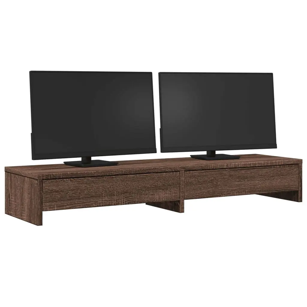 Enhance your workspace with this practical dual monitor stand for better viewing comfort and style.Stable and durable material: Engineered wood is a durable and stable material with a smooth surface that is warping, and splitting, making it a reliable choice for various projects.Ample storage space: The screen stand includes 2 drawers, offering extensive storage options for all your office essentials and helping to keep your workspace organized and clutter-free.Easy maintenance: Thanks to its smooth surface, the monitor platform is easy to clean with a damp cloth and requires less maintenance.