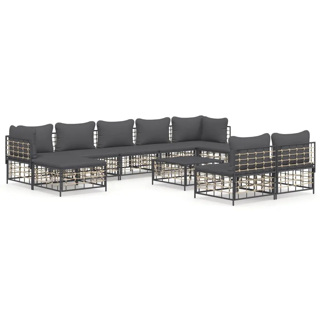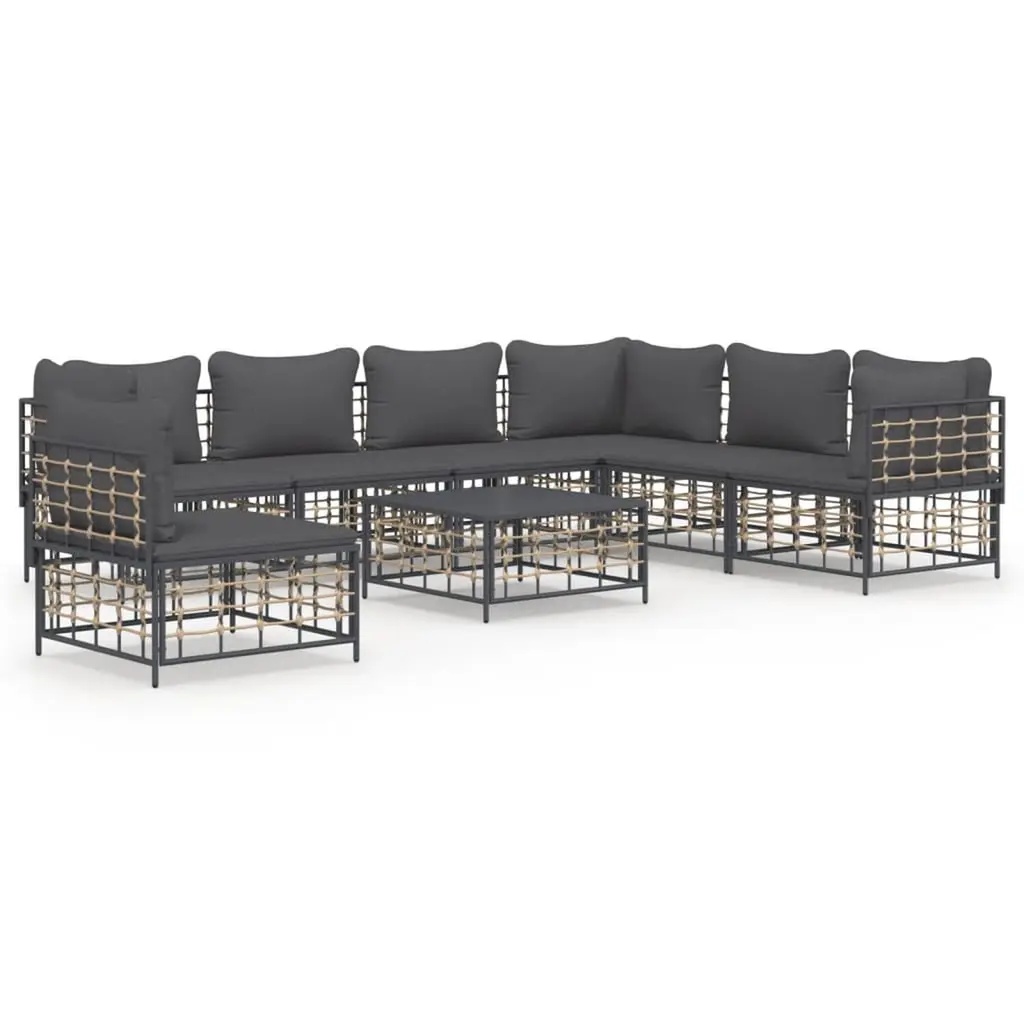 Enjoy a cozy coffee time in your outdoor space with this garden lounge set! It is a perfect addition to your garden and terrace, creating a lasting impression!Weather-resistant material: Poly rattan is weather resistant and easy to clean. It remains beautiful on the outside for a long period of time. It's more economical than other materials, while offering great quality, convenience and an aesthetic look.Sturdy and stable frame: The steel frame of the lounge set ensures sturdiness and stability.Comfortable seat experience: The backrest adds extra seating comfort for the lounge set. Also, the thickly padded cushions provide comfort for your sitting time.Sturdy tabletop: The sturdy tabletop of the coffee table is perfect for placing meals, drinks, vases, fruit bowls, or other decorative items.Modular design: The garden furniture set is flexible and easy to move around, so you can combine it with other modular segments in the webshop to create your own personal garden lounge set configurations!Note:To make sure your outdoor furniture stays beautiful, we recommend protecting it with a waterproof cover.Corner sofa:Color: AnthraciteMaterial: Poly rattan, powder-coated steel, textileneDimensions: 28.3" x 28.3" x 26" (W x D x H)Seat width: 27.6"Seat depth: 27.6"Max. load capacity: 242.5 lbTable:Color: AnthraciteMaterial: Poly rattan, powder-coated steelDimensions: 27.6" x 27.6" x 13.4" (W x D x H)Max. load capacity: 242.5 lbCushion:Cushion color: Dark grayMaterial: Fabric (100% polyester)Seat cushion filling material: FoamBack cushion filling material: PP cottonSeat cushion dimensions: 27.6" x 27.6" x 2" (W x D x T)Back cushion size: 27.2" x 16.1" (L x W) / 21.3" x 16.1" (L x W)Assembly required: YesDelivery contains:4 x Corner sofa4 x Seat cushion8 x Back cushion1 x Table