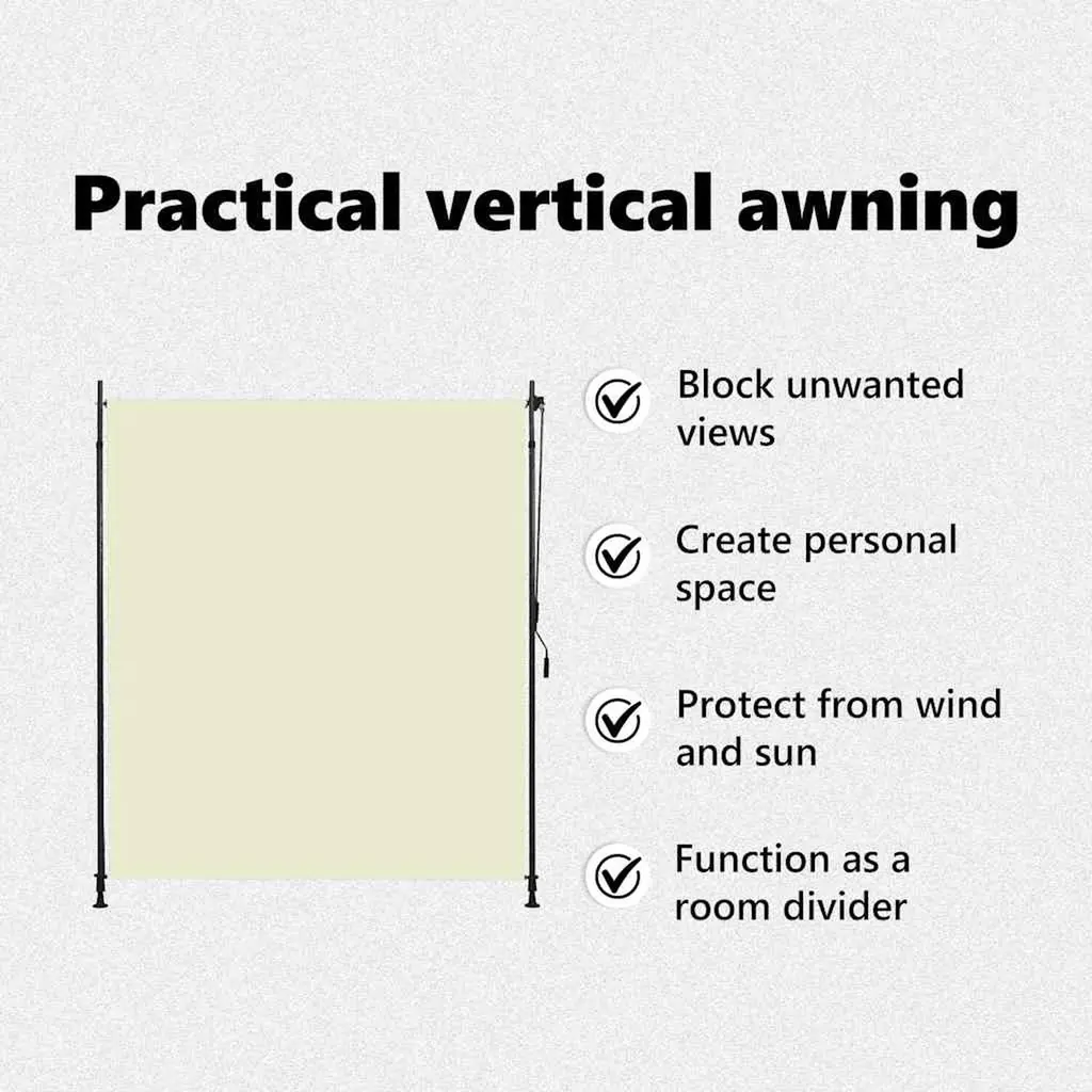 This cream outdoor vertical roller blind is the perfect way to create a comfy and private outdoor spot. Made from high-quality polyester and aluminum, this sunshade effectively blocks harsh sunlight while letting a nice breeze through, making it ideal for patios, balconies, and outdoor hangout areas. Height Adjustment: This roller blind has a manual height-adjustable mechanism, so you can adjust the shade to your comfort level. Changing the height is a breeze, making it easy for everyone.UV Resistance: Made with UV-resistant materials for long-lasting durability against sun exposure. This feature protects your outdoor furniture from fading while keeping you and your loved ones safe from harmful rays.Versatile Use: This roller blind is ideal for balconies, patios, and porches, providing both shade and privacy. Whether you’re soaking up the sun or having a party, this blind boosts your outdoor experience.Elegant Design: This cream roller blind matches perfectly with contemporary outdoor styles, enhancing your space with a modern touch.Easy Installation: Comes with everything you need, including a hand crank system and two standing posts, so setup is simple for anyone.